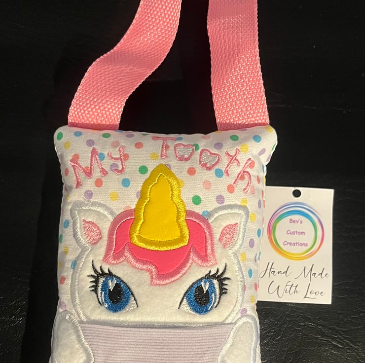 Handmade embroidered Tooth fairy pillow, no more searching for your little ones tooth under there pillow, just hang this little cushion on the door and place the tooth in the pocket.
