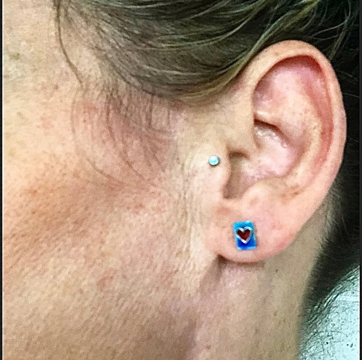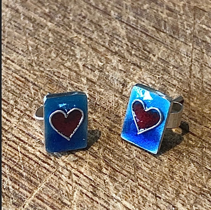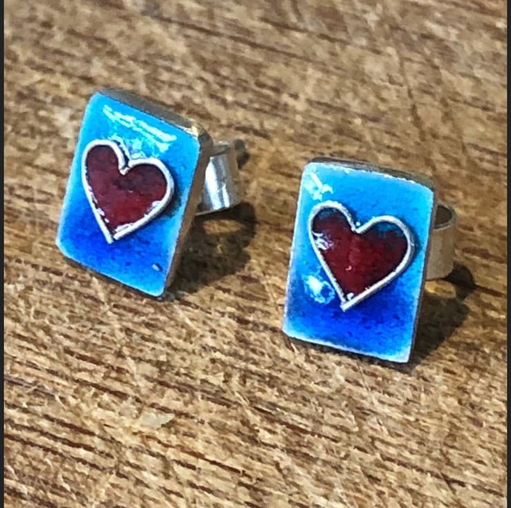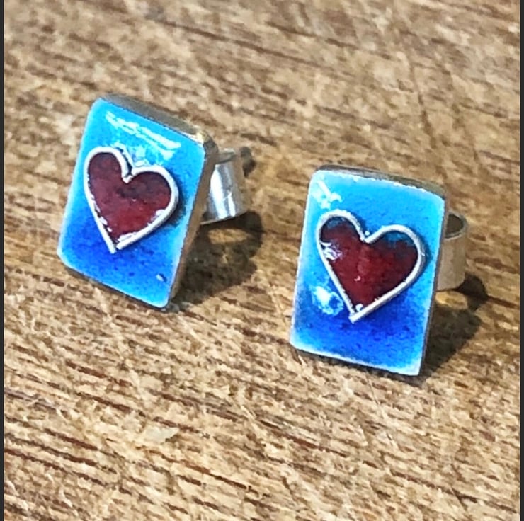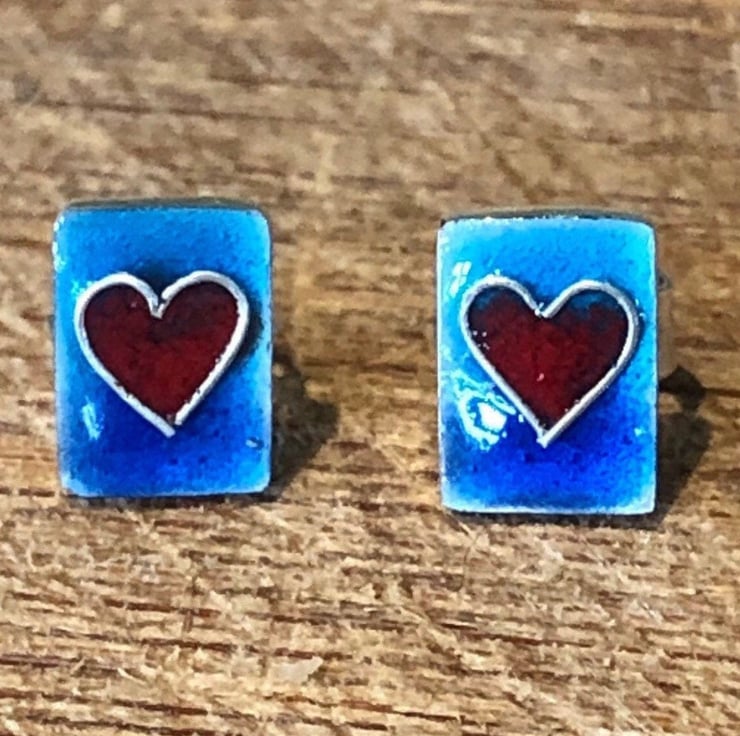 These Enamel Studs have been handcrafted from Recycled Sterling Silver, Fine Silver and vibrant blue and red enamels. They measure approximately: 9 x 6mm in size and have high polished silver backs. The posts and butterfly backs are also Sterling Silver.