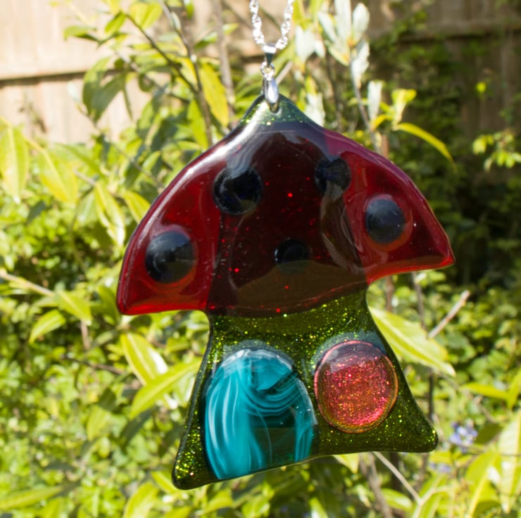 Suitable for hanging in a window or in the garden, it has been made from pieces of hand-cut glass decorated with pre-prepared dots. A session in the kiln fuses everything together. When it's cool we drill a hole & mount the stainless-steel chain from which it hangs. It is approximately 8.5 cm across at the top.