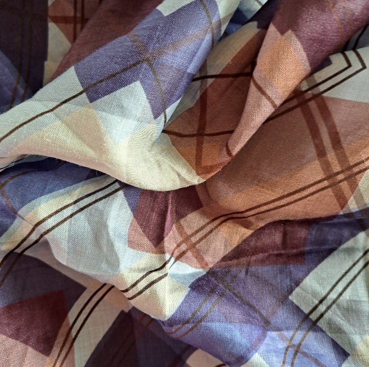 1 Blue and claret argyle pattern. This looks like cotton voile but there might even be something silky in there. Beautiful. 150cm long and 66cm wide (selvedge side).