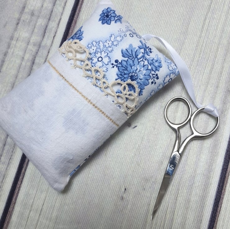 Handmade vintage fabric pin cushion with small scissors. Scissors can easily be detached. A beautiful addition to your sewing room or the perfect gift for a crafty friend!