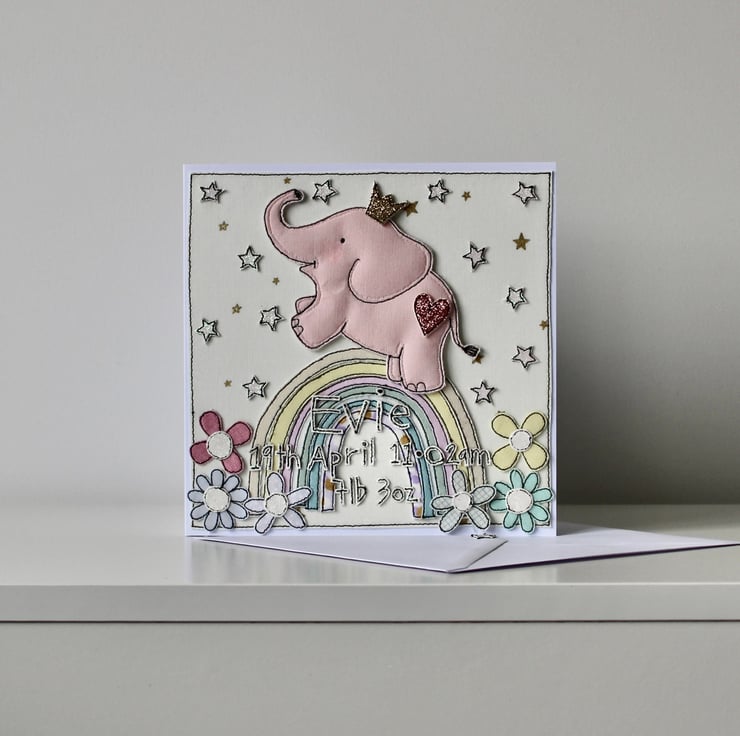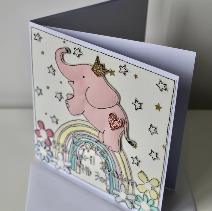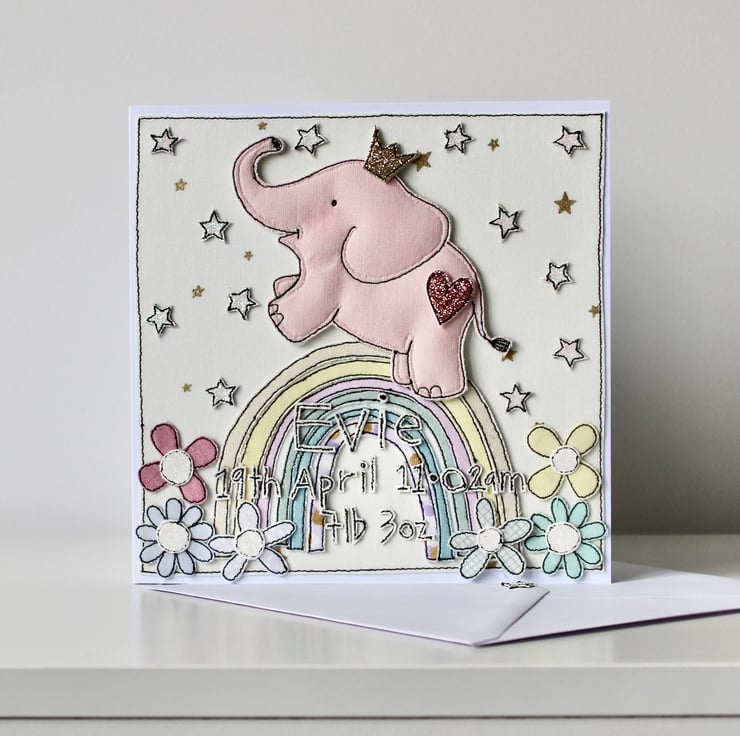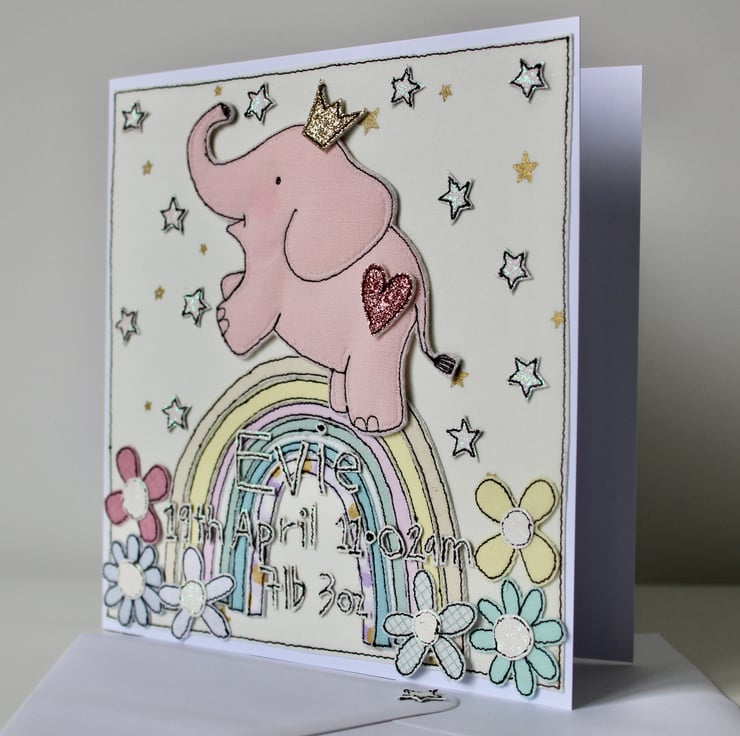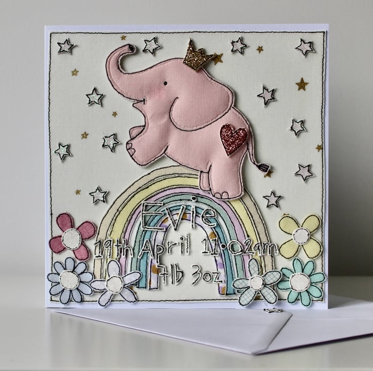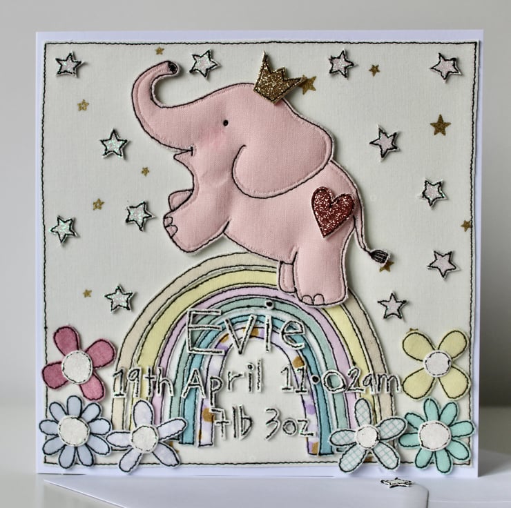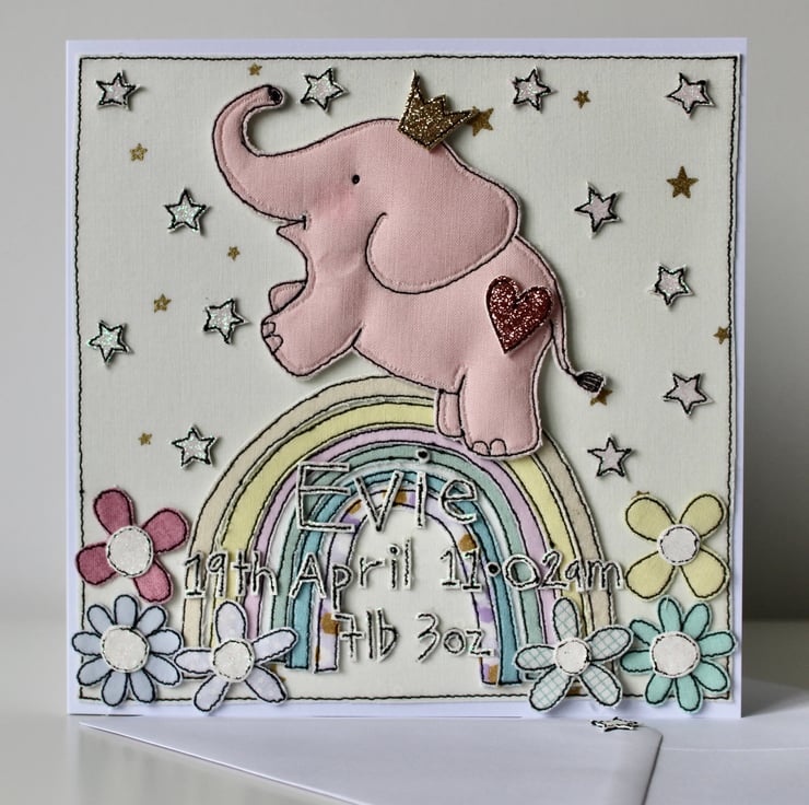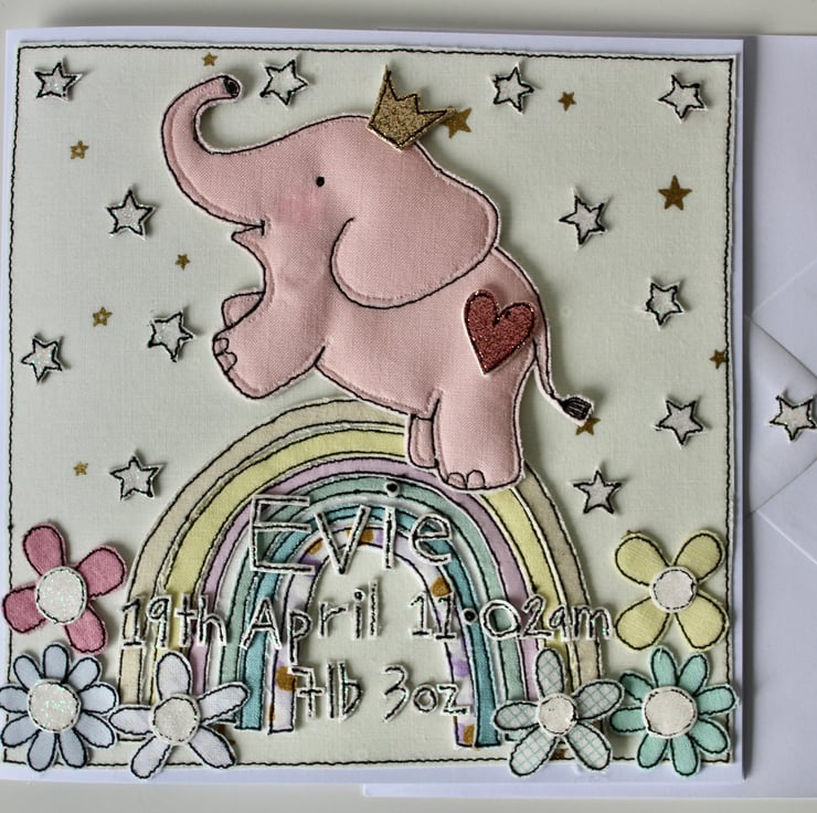 A handmade card which includes an elephant, a rainbow, six blooms, a heart, a crown and stars. With the sewn words 'Evie', '19th April', '11.02 am' and '7lb 3oz'.
