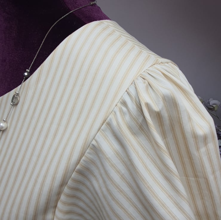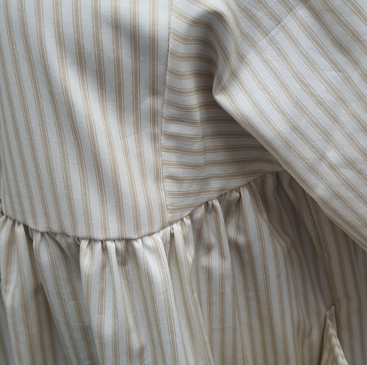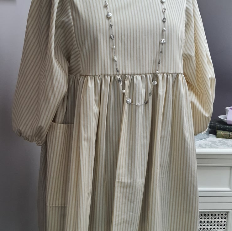 This lovely tunic dress is made from 100% cotton fabric in a pretty muted shade of ochre and white ticking stripe and has two pockets. It is a loose fit that will suit up to size 16. Length is 41 inches.