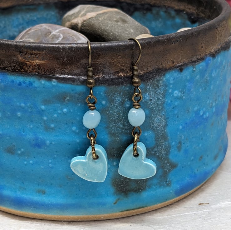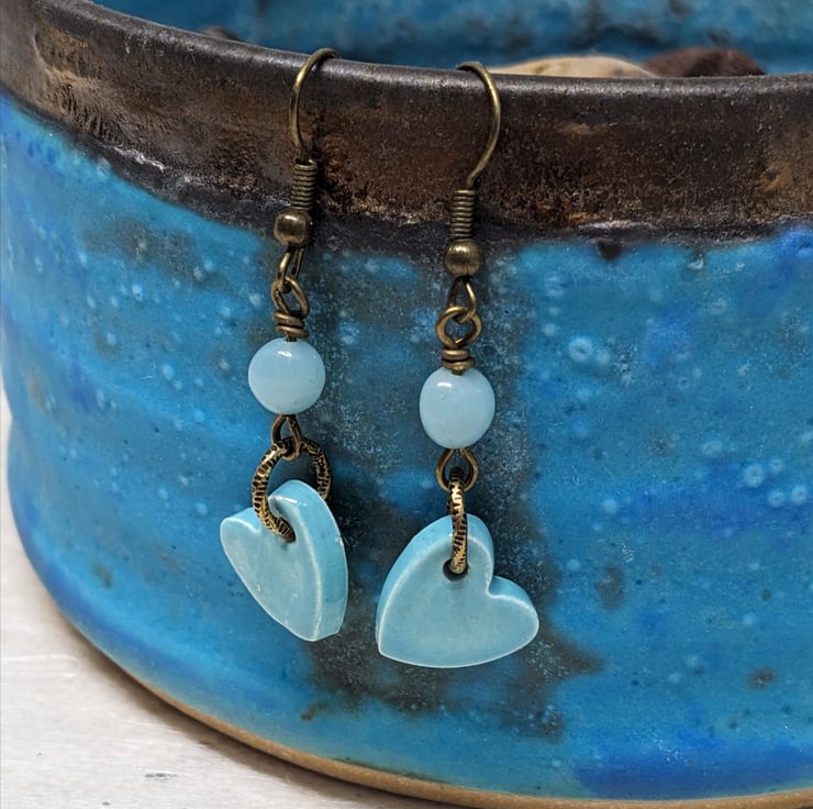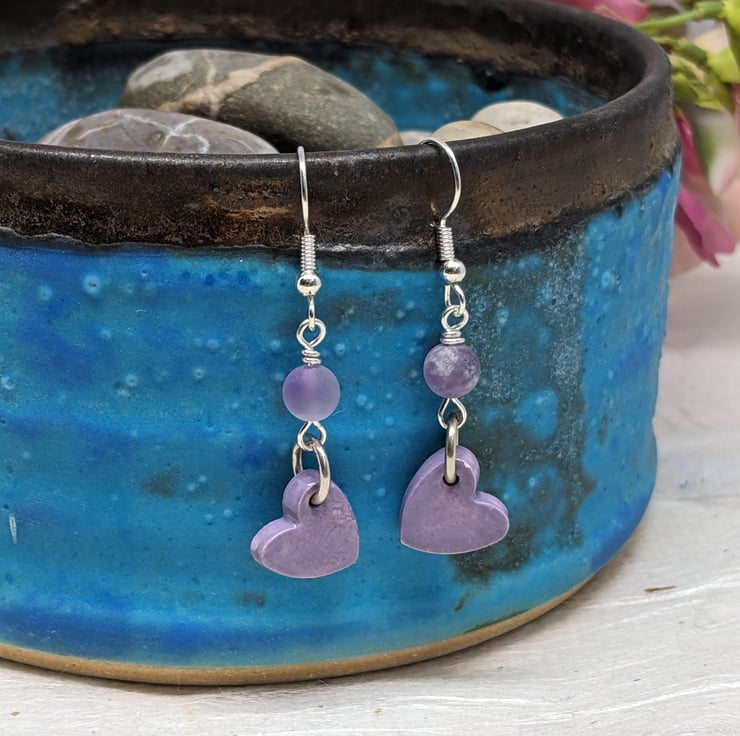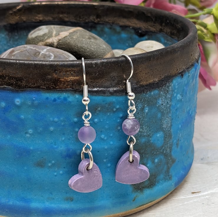 These earrings both feature a handmade ceramic heart charm. The lilac pair has an added amethyst bead and silver plated findings, the lilac has amazonite and antique gold.