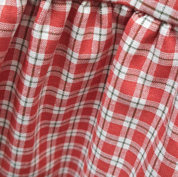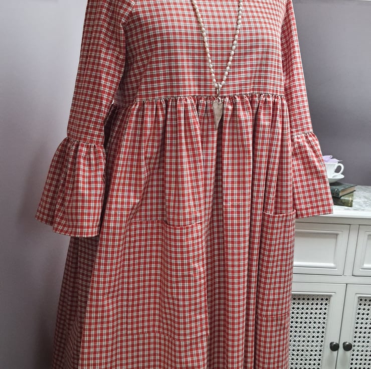 This gorgeous free fitting dress is made from vintage check fabric and and is totally unique. It will comfortably fit up to size 12 and is 40 inches long from back of neck. It also has two gingham pockets and deep frills to the sleeves