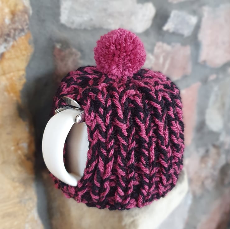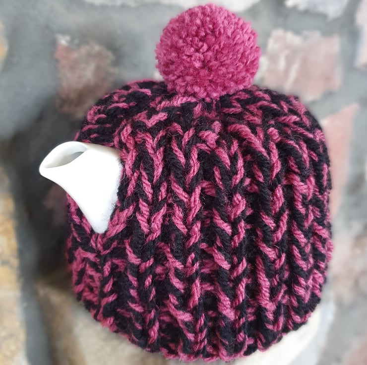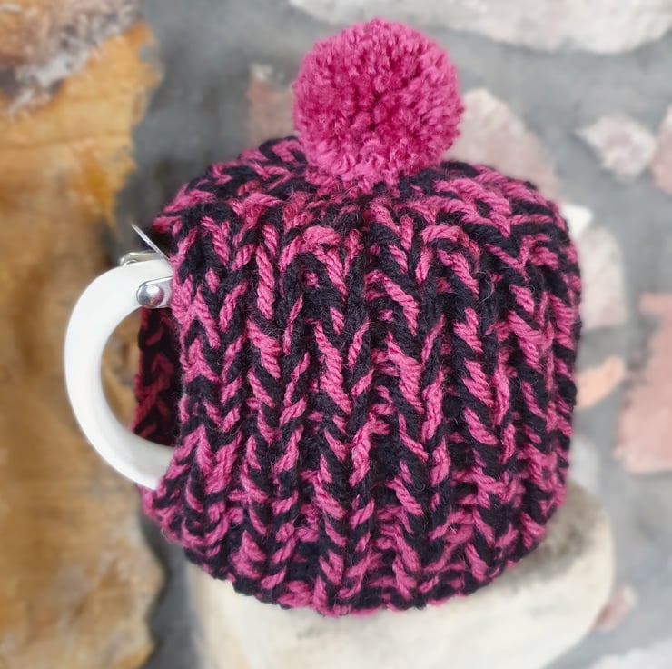 Hand knitted using double strands (two balls at the same time) of Aran weight yarn in a 1 x1 ribbed pattern, makes this cosy extra thick. It's not called a cosy for nothing!