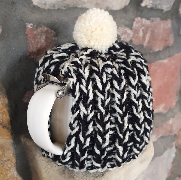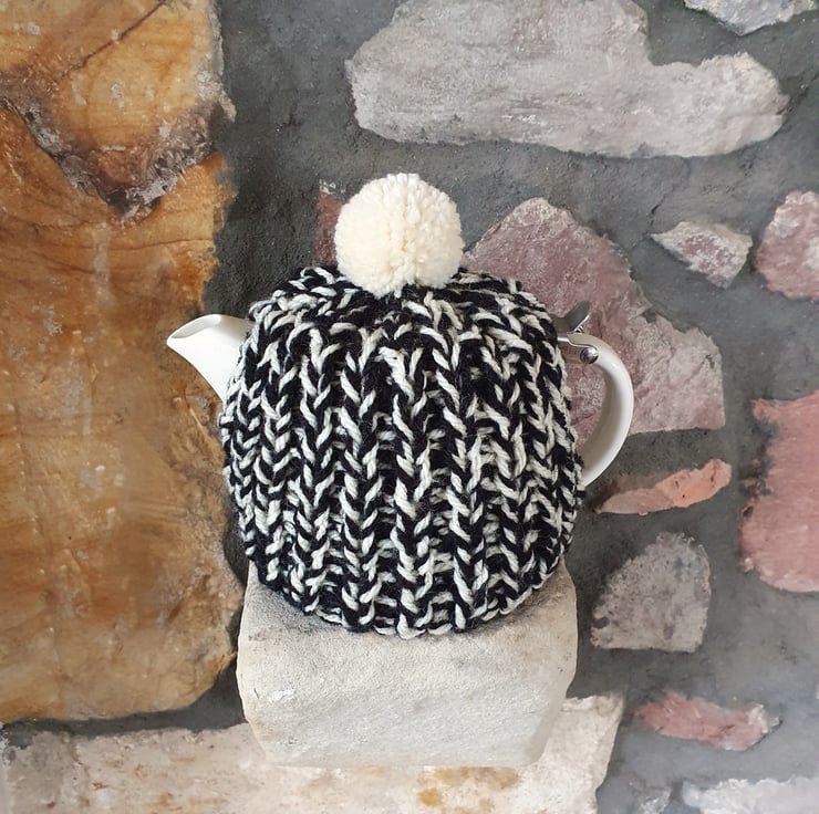 Hand knitted using double strands (two balls at the same time) of Aran weight yarn in a 1 x1 ribbed pattern, makes this cosy extra thick. It's not called a cosy for nothing!