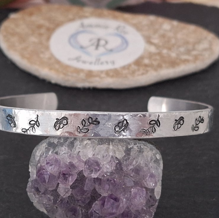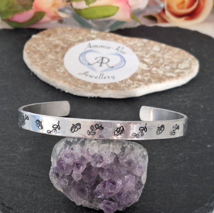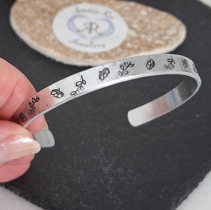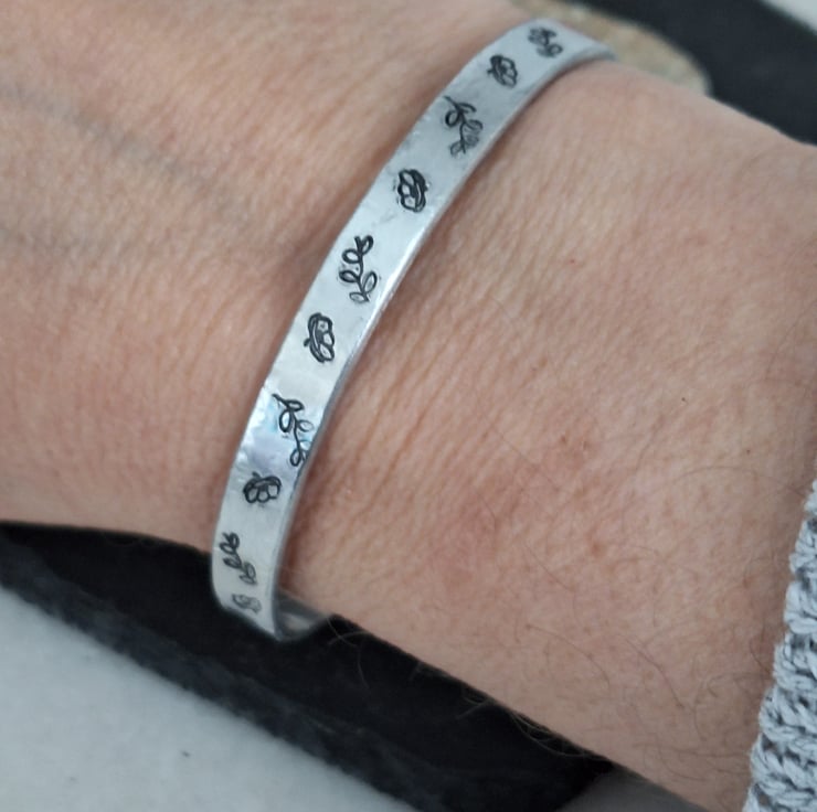 Little leaf sprigs and dainty poppy blooms have been scattered along the length of this open bracelet, then darkened with jewellery ink. Over time the ink will fade (keep it darker for longer by protecting your cuff from water/moisture) but the pattern will remain.