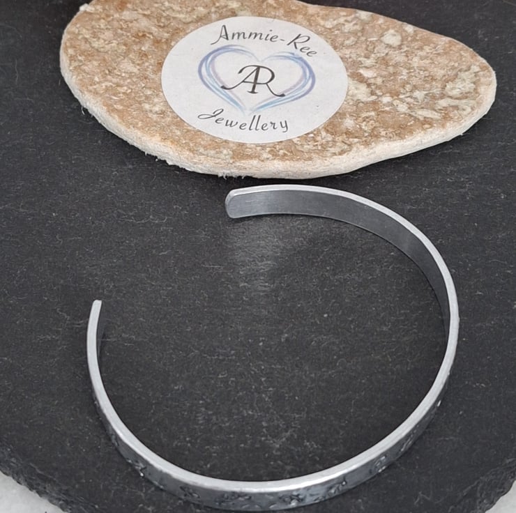 A pretty 6mm wide standard fit (15cm) cuff in silver tone Aluminium. (Hypoallergenic, non tarnish and it won't turn your wrist green).