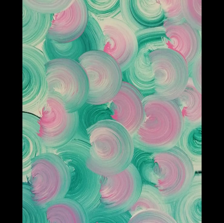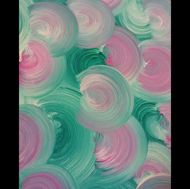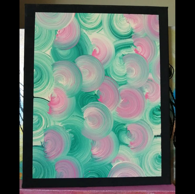 Eye catching abstract watermelon coloured swirls with a black painted border. This has been created with acrylic paints on a canvas. This artwork comes varnished and with a certificate of authenticity.