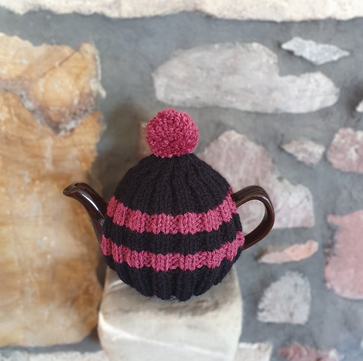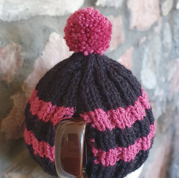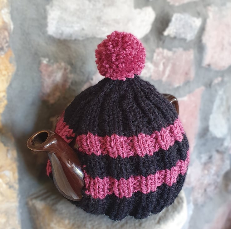 Small Tea Cosy for 2 Cup Tea Pot, Solid Black and Raspberry Pink Stripes, Hand Knitted
