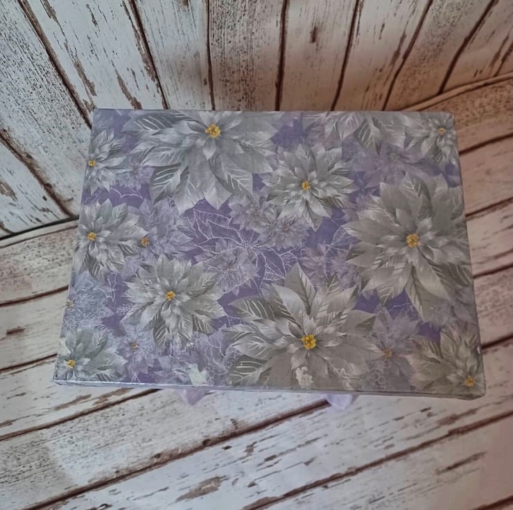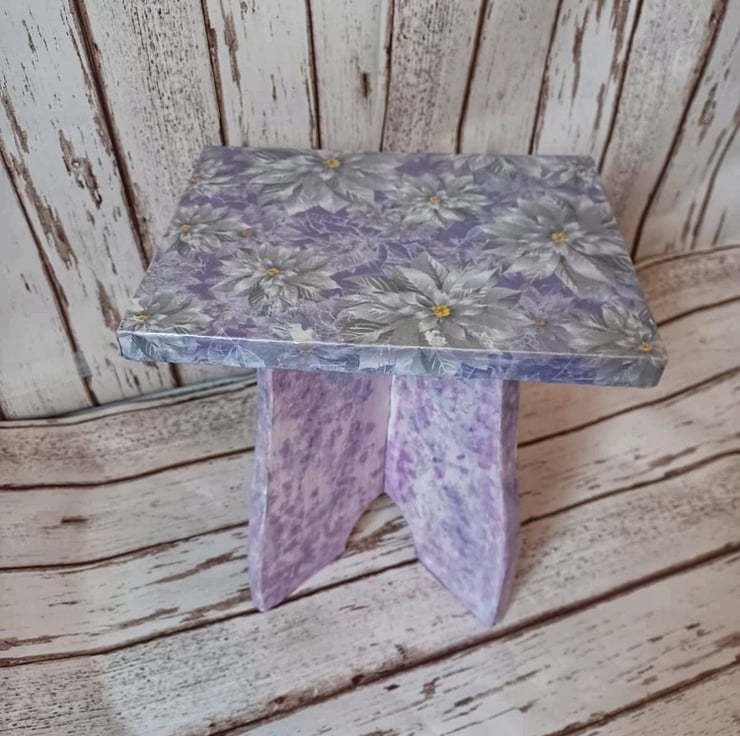 Lilac footstool measuring 20 x 27 x 28 cms featuring decoupaged daisies on a purple background on the top. Varnished to preserve hardwearing and longevity. A beautiful addition to your home! Postage to be discussed as per customer wishes and managed accordingly.