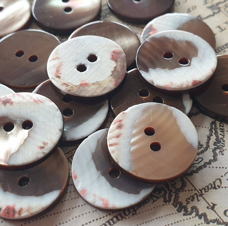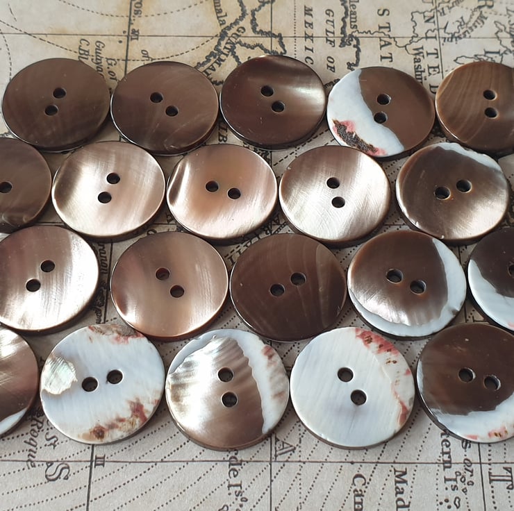 Excellent Quality Brown real pearl shell buttons:very flat and the reverse side is random and beautiful too only 700 available and definitely not repeatable.