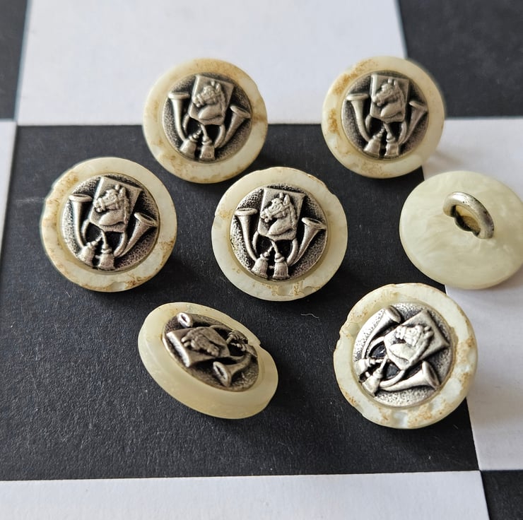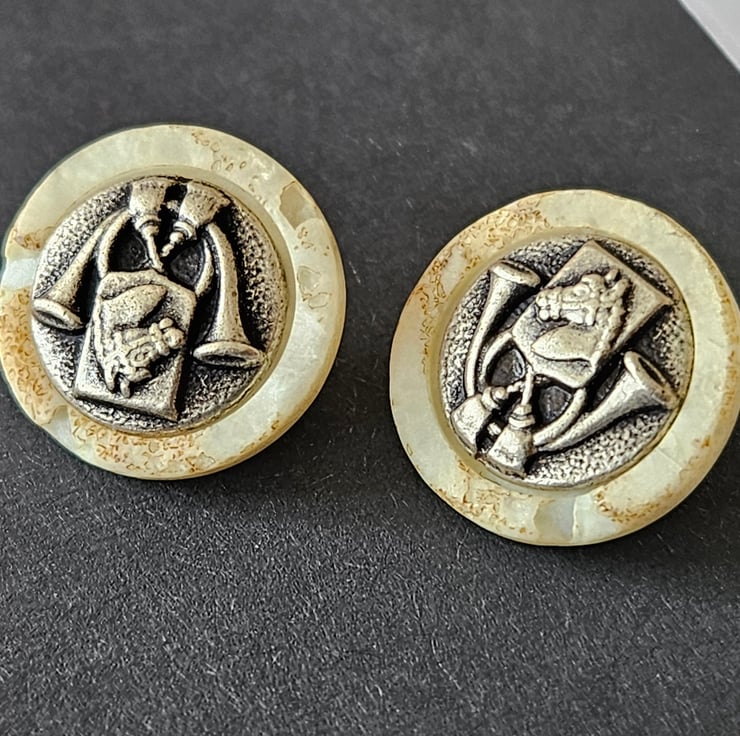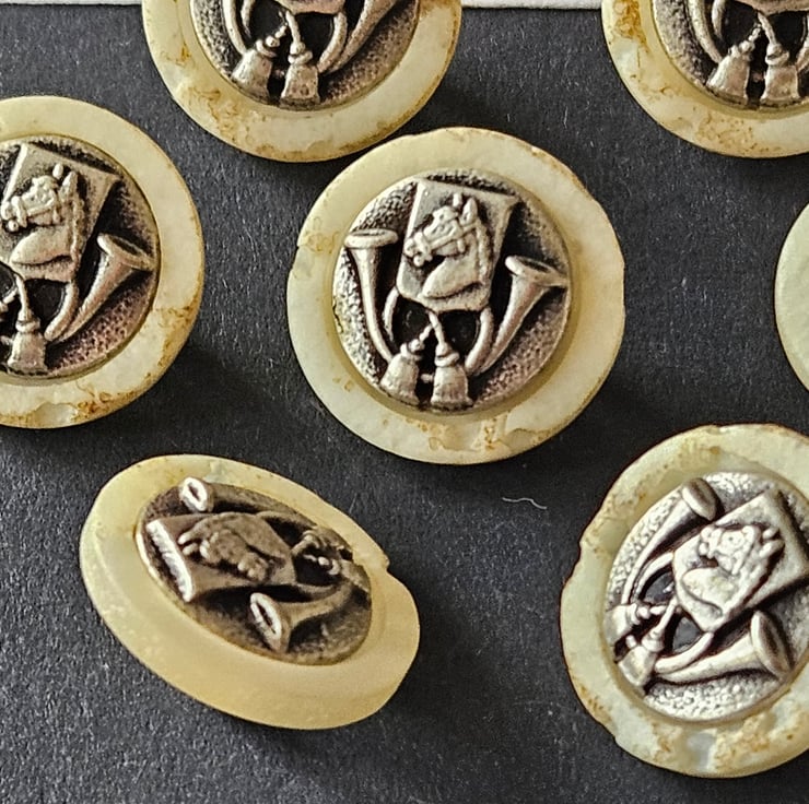 15mm 24L Antique Silver and Polyester Pearl buttons HORSE and TRUMPET
