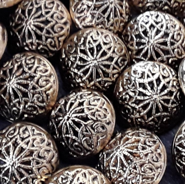 Light weight material, ABS. Looks like metal without the weight of alloy metal, making them very use-able on many fabrics etc.