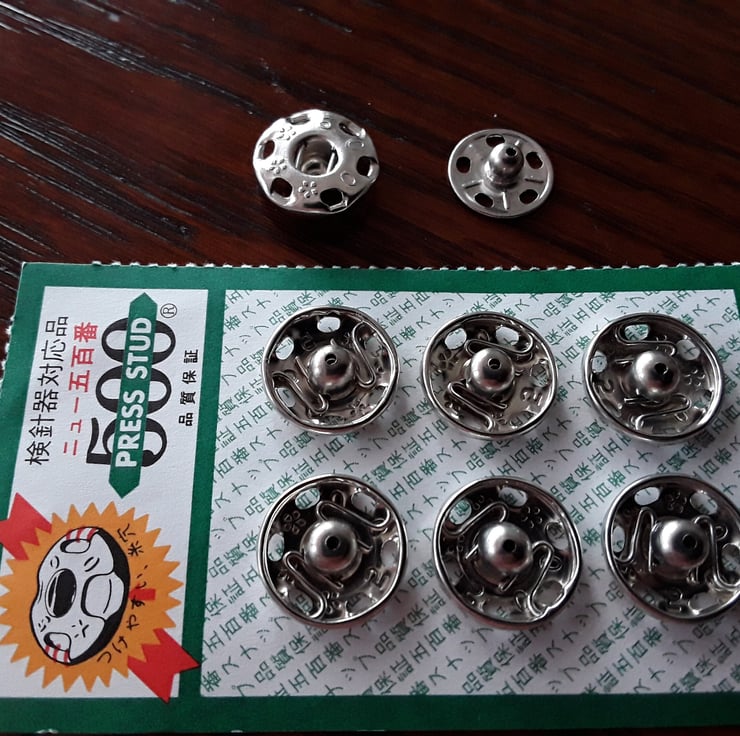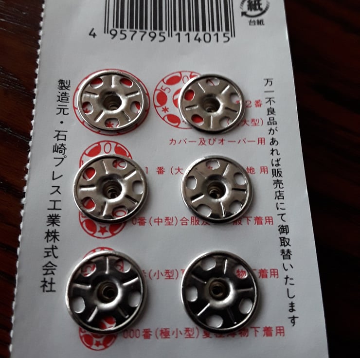 Card of 6 sets / pairs 13mm Press Studs. Japanese Quality