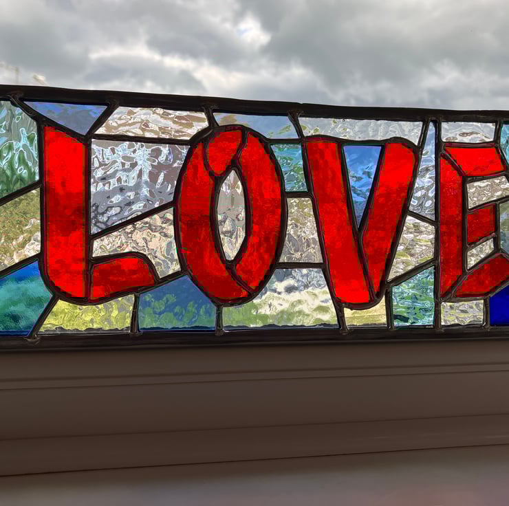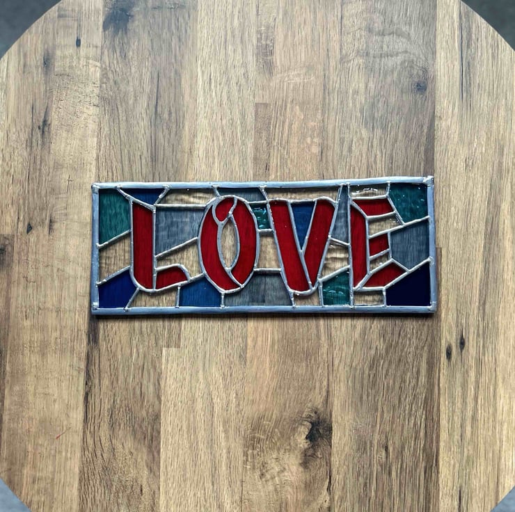 This one-off piece, 'Love' in Stained Glass; the ultimate declaration of love for any special someone. This lovingly crafted Tiffany style stained glass measures a generous 12 inches long by 5 inches high, and features a beautiful combination of blue, red, and white.