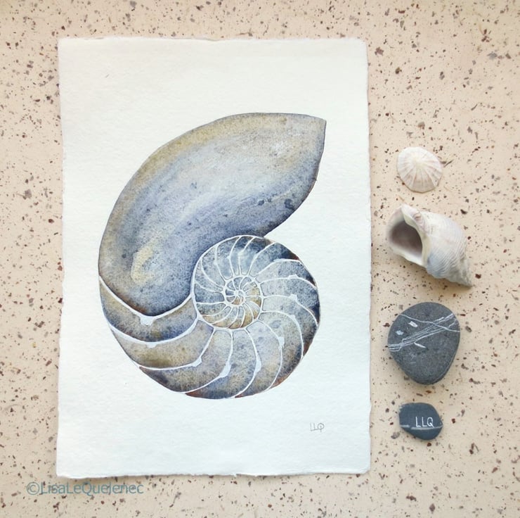 An original watercolour illustration painting of a chambered nautilus shell.