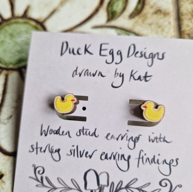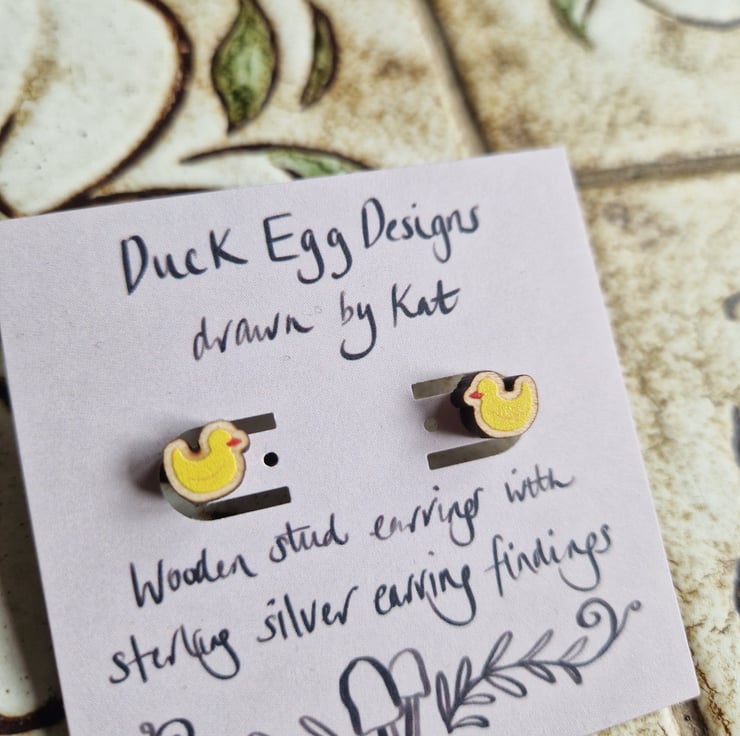 Little rubber duck earrings illustrated by me and made using FSC certified wooden charms that have been produced in the UK.