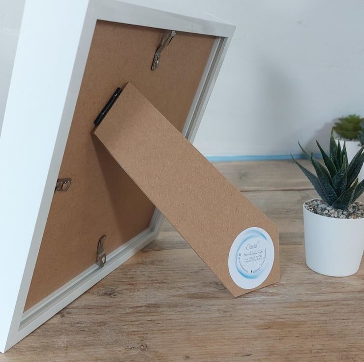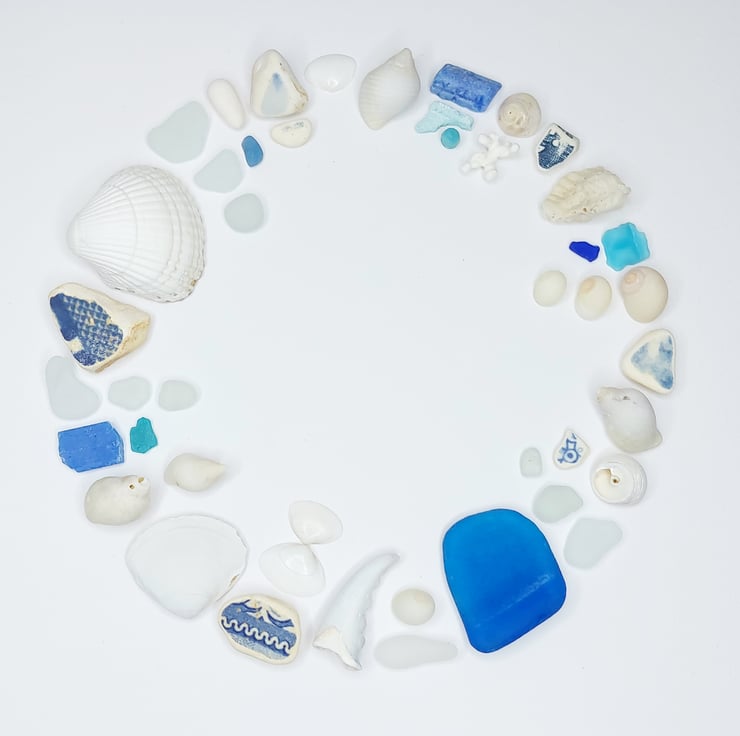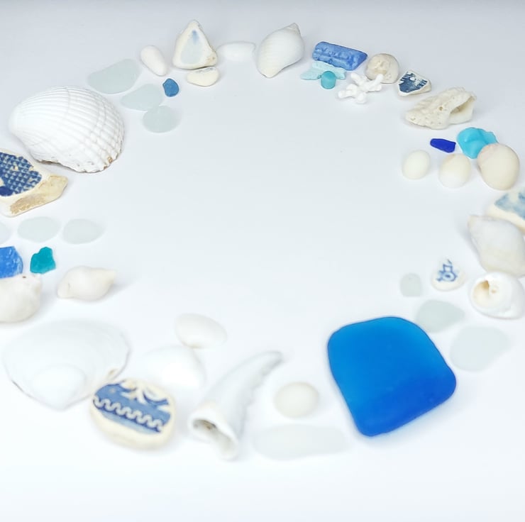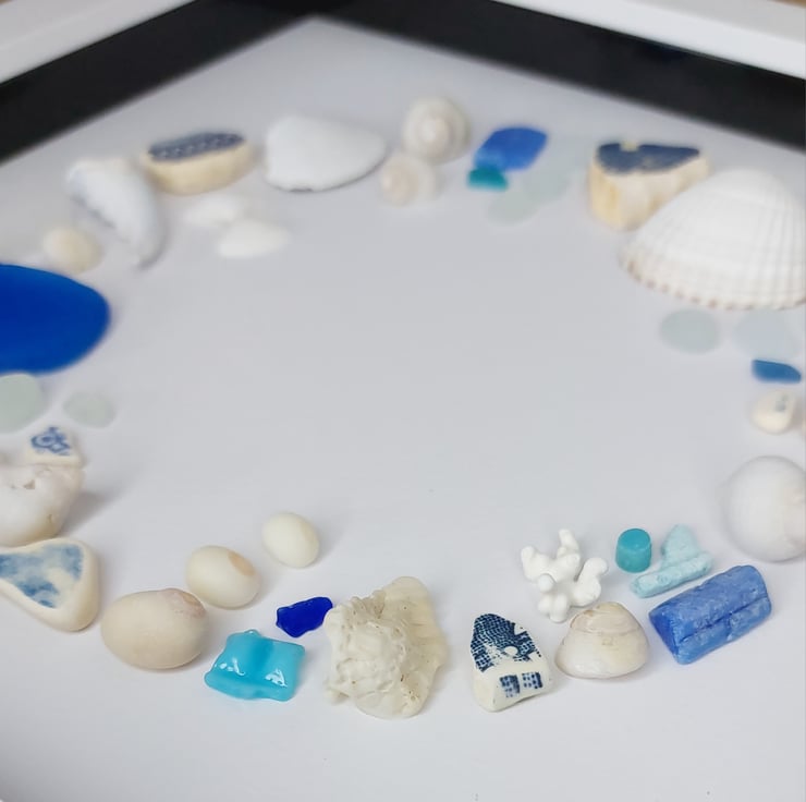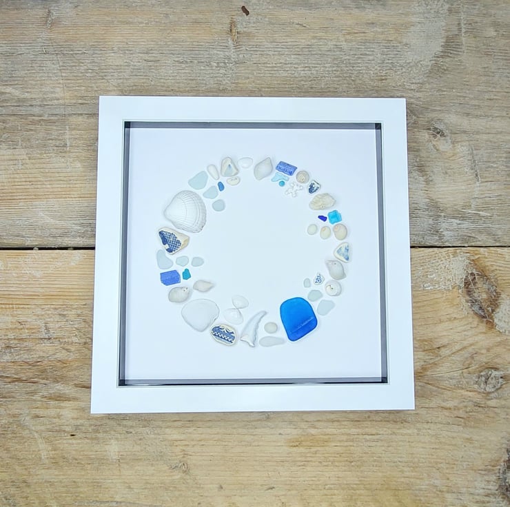This 9in x 9in white frame with black insert. Holds this beautiful ocean colours from my beachcombing finds. The blues and whites circular art is made from seaglass, shells, beach plastic, seawashed pottery and a tiny piece of coral.