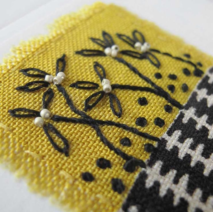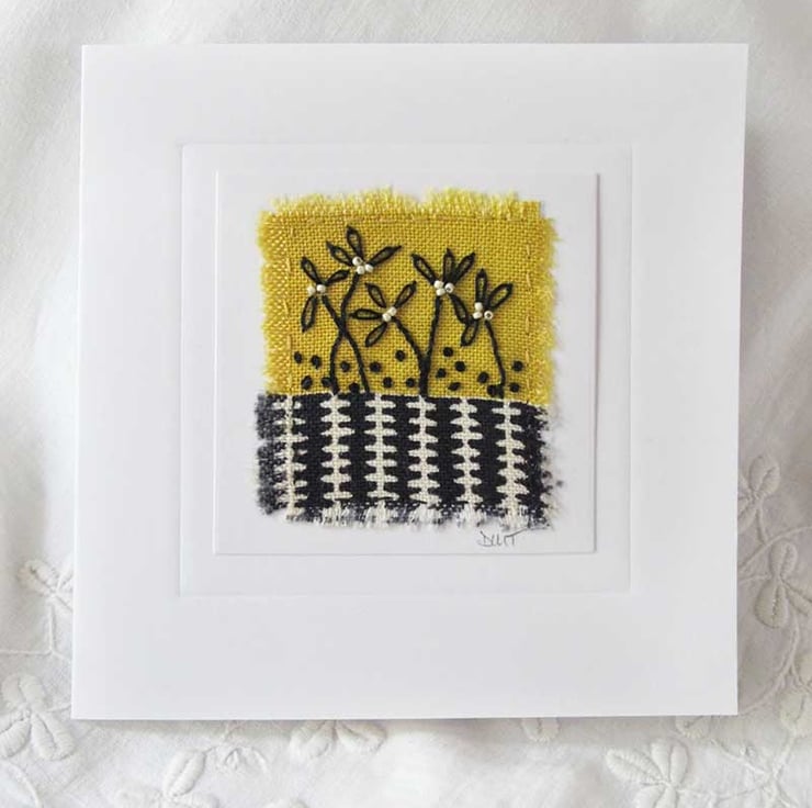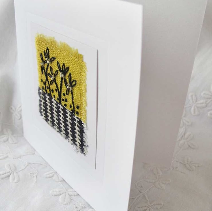 This beautiful card has been embroidered by hand onto genuine 1950's fabric. The embroidery design is of stylised flowers in black, on a golden yellow with black and white patterned background. Each flower has a cluster of little metallic coated cream coloured beads in the centre of it. Perfect for a special occasion, it has been left blank for your own message. The embroidery has been mounted on card and then mounted onto the card base with an embossed frame around it.