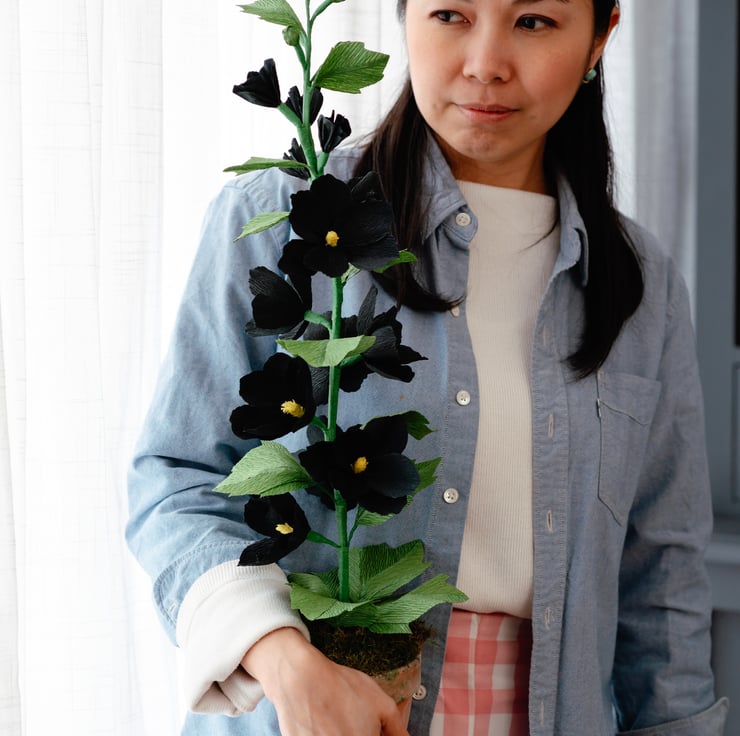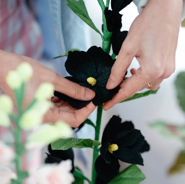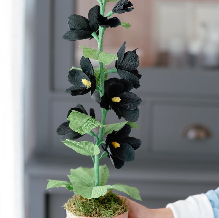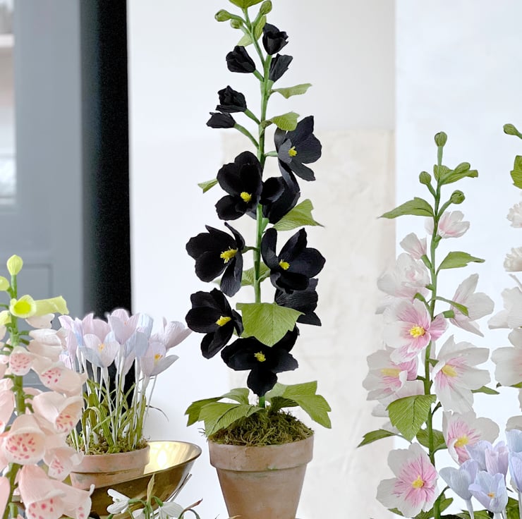 This showstopping inky Paper Hollyhock is made from specialty Italian crepe paper that is exquisitely sculpted to produce this much-loved English garden staple. The pitch-black petals dramatically stand out in a garden of blousy pastel flowers or a in a backdrop of minimalist walls.