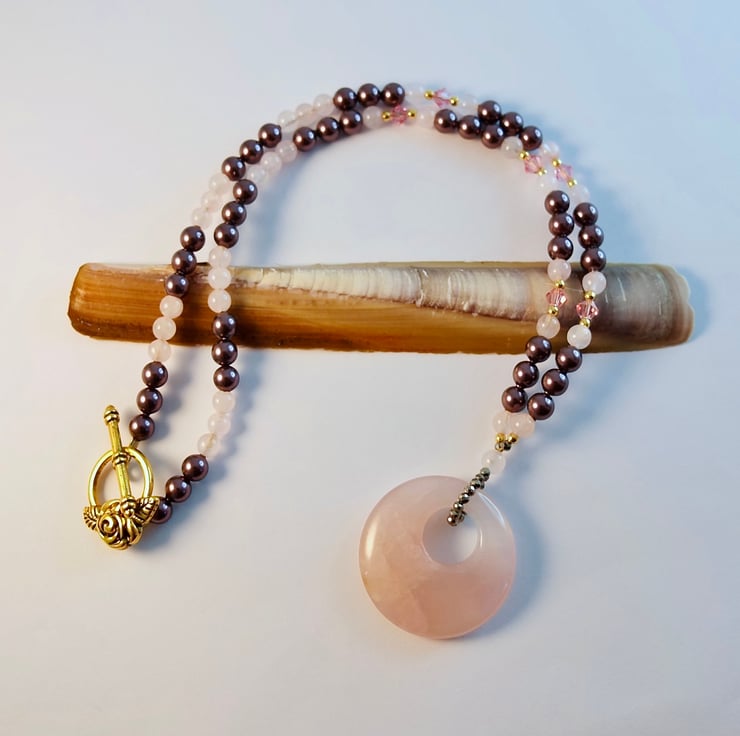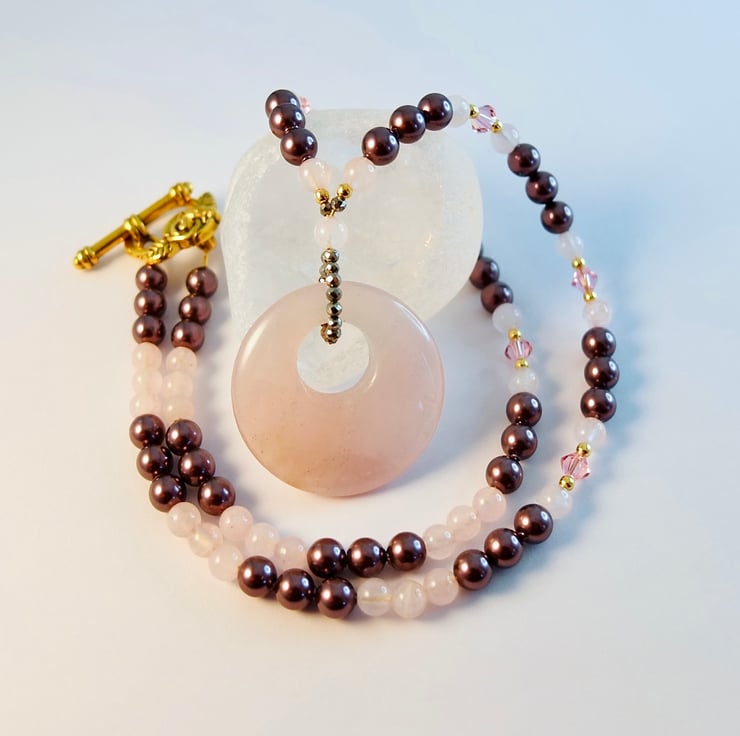 Elegant Pearl and Rose Quartz necklace in pink and purple shades, with 5mm Austrian 'crystal Burgundy' glass pearls, 4mm Rose Quartz and 4mm sparkly Austrian 'light rose' crystal bicones, with a centrepiece of a Rose Quartz donut pendant.