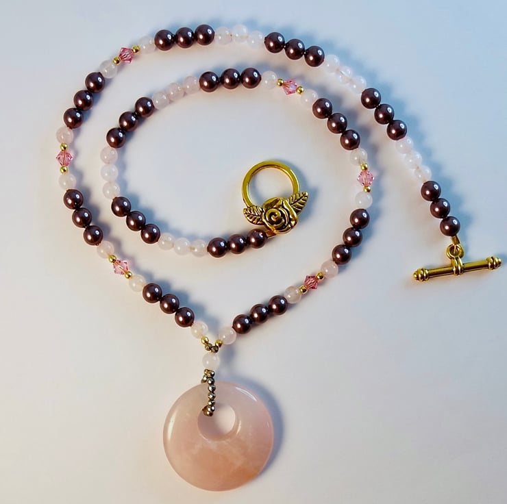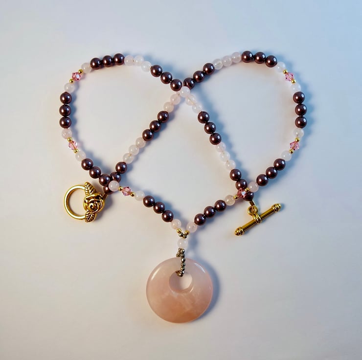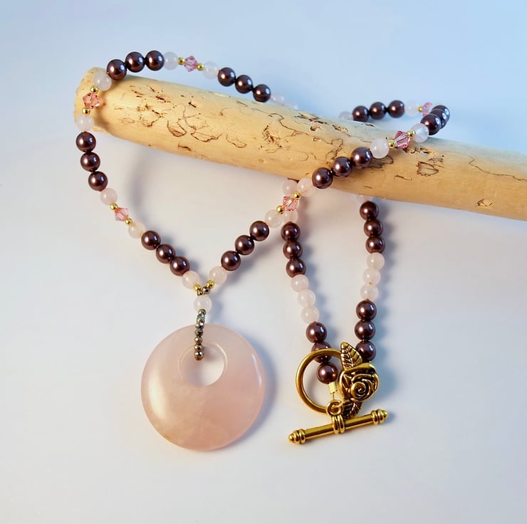 Rose Quartz Donut Necklace, Pearl & Crystal - Anniversary Birthday Handmade Gift