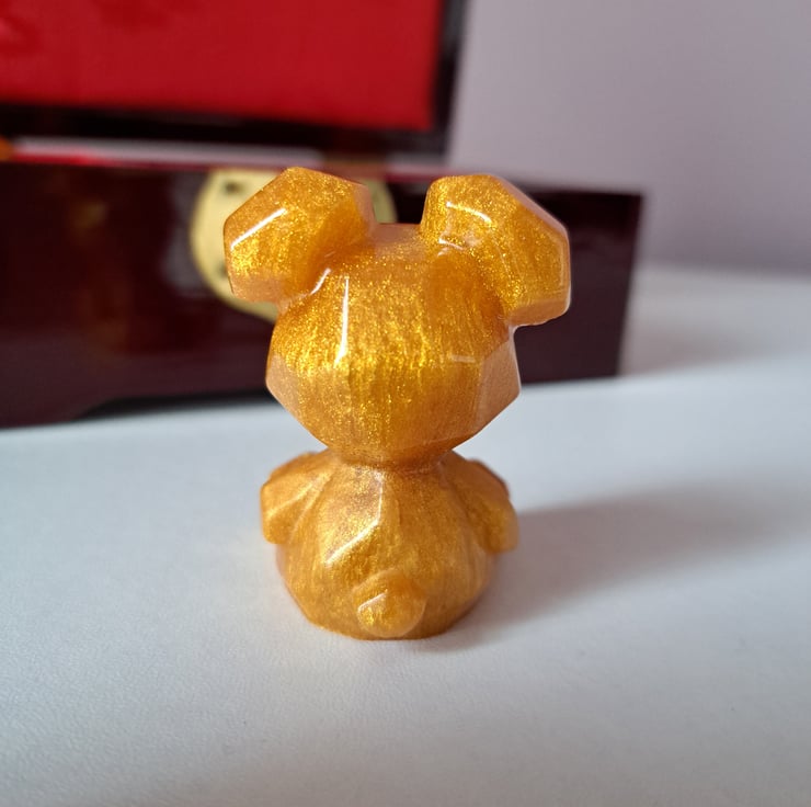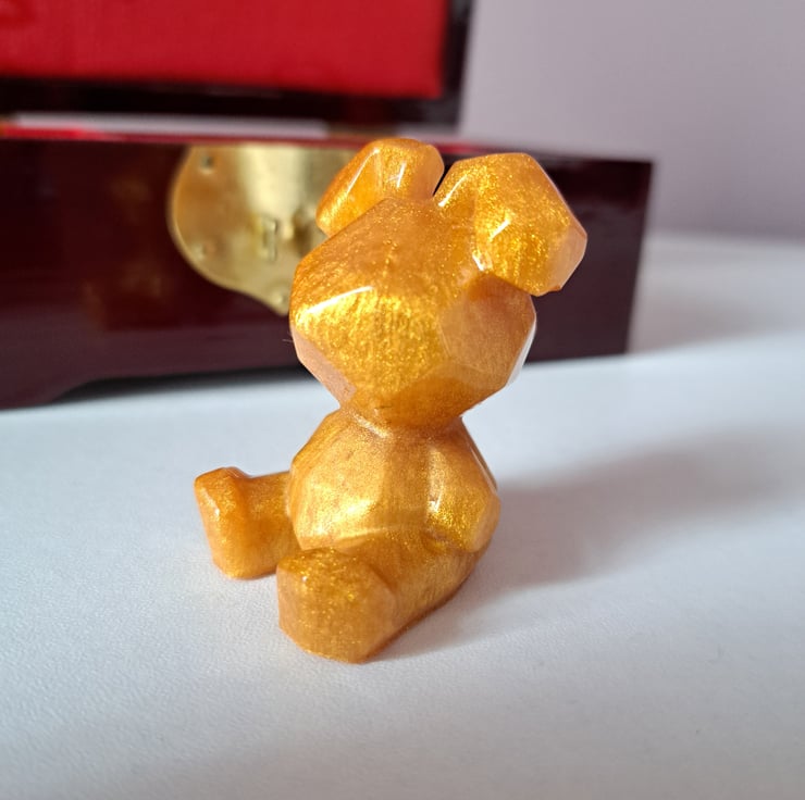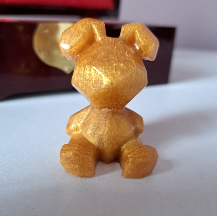 An unusual, geometric rabbit figurine made from epoxy resin and coloured sparkling gold with mica powder.