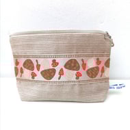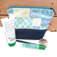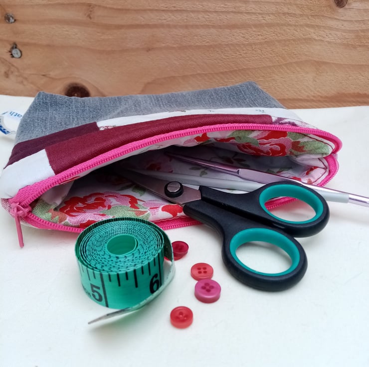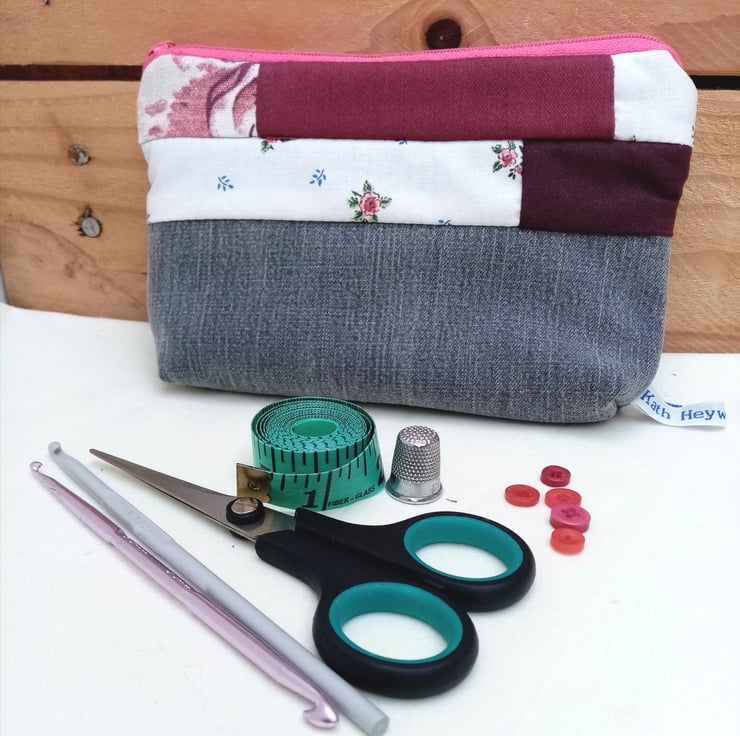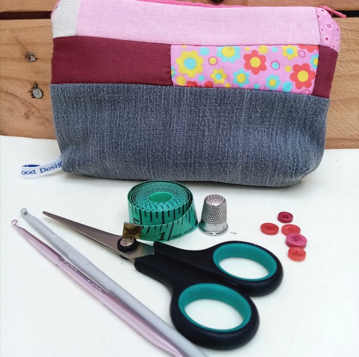 Patchwork pouch with a zip fastening made from a mix of pink fabrics and grey denim.