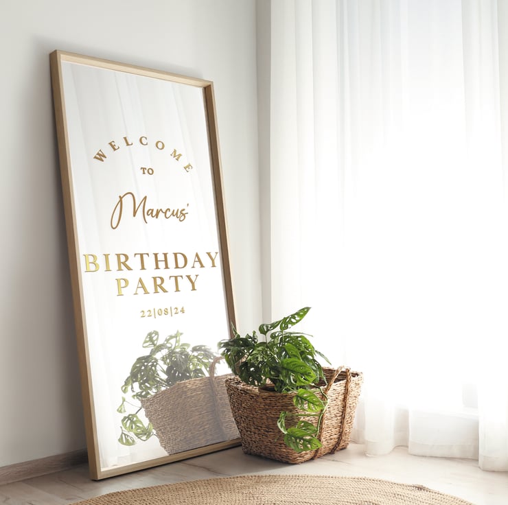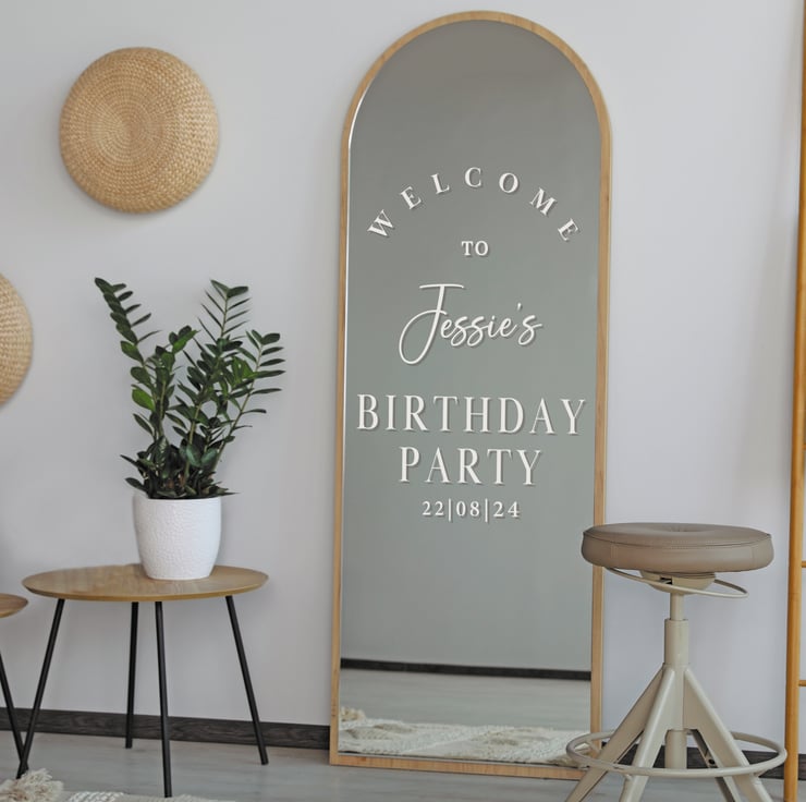 Elevate your DIY birthday decor with our personalised welcome mirror or sign sticker. Add a touch of charm and warmth to your celebration by customising this sticker with a name and date creating a warm welcome for your guests.