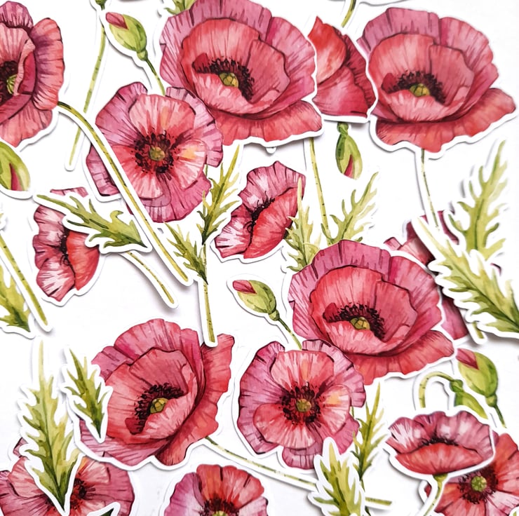 A set of handmade die cuts / ephemera / embellishments with a pretty red poppy flower theme printed onto 250gsm silk card. Wonderful for card making, scrap book layouts, journaling, etc. Just stick using glue, double sided tape or 3D foam pads.