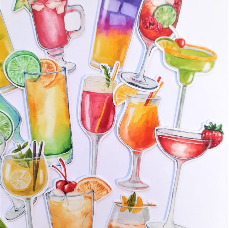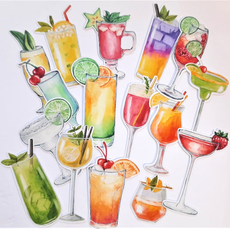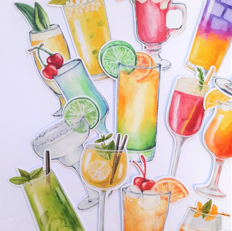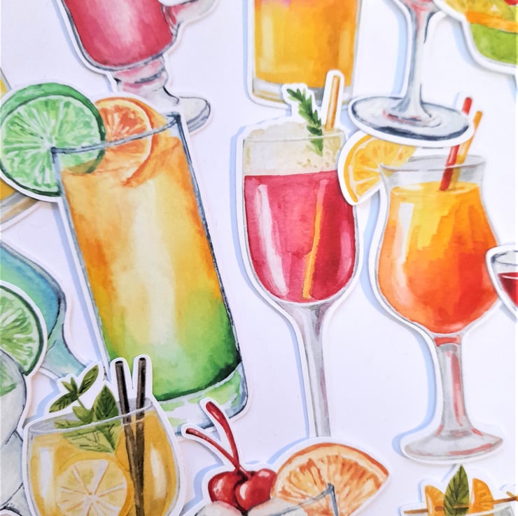 One set of handmade die cut ephemera / embellishments with a cocktail drinks theme in vibrant colours printed onto 350gsm glossy card. Perfect for card making, party invitations, scrap book layouts, journaling, etc. There are 16 pieces in each pack. Sizes range from 4cm to 9cm. Simply fix with glue, double sided tape or 3D foam pads.