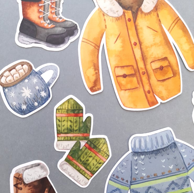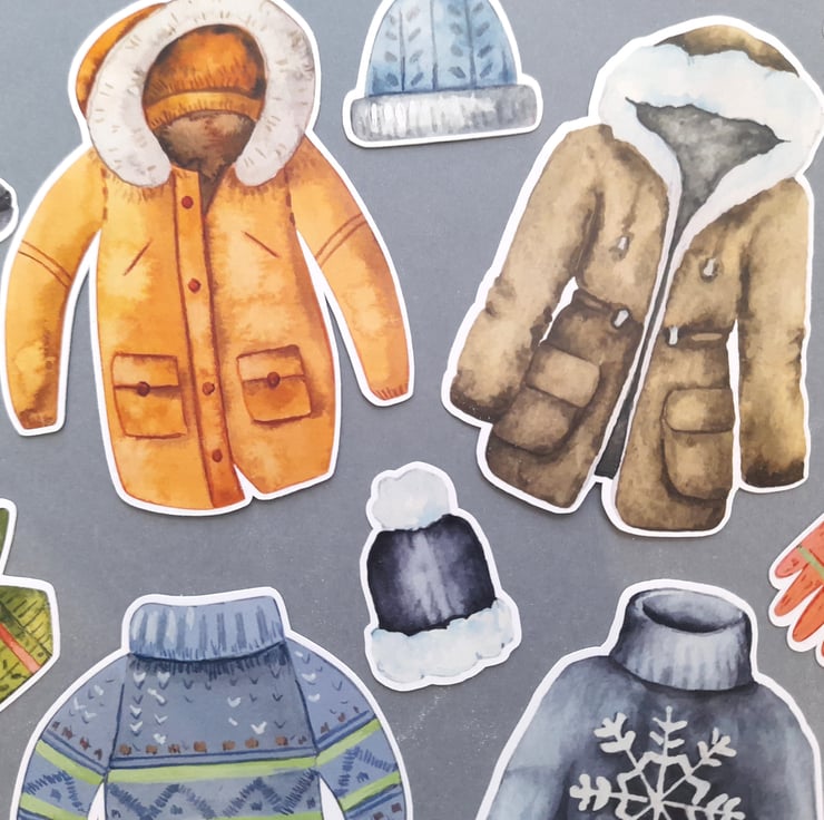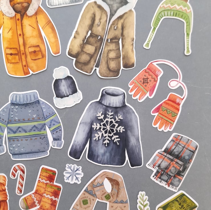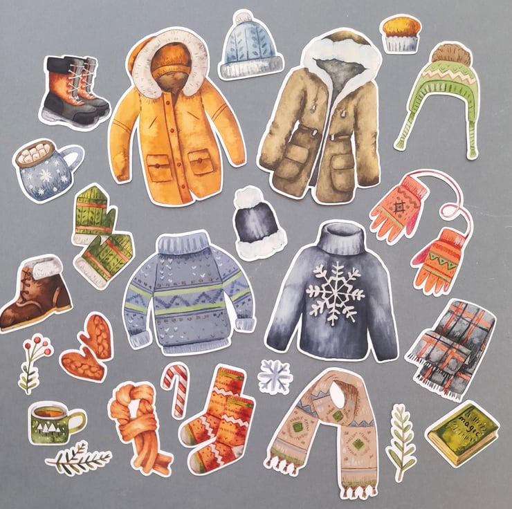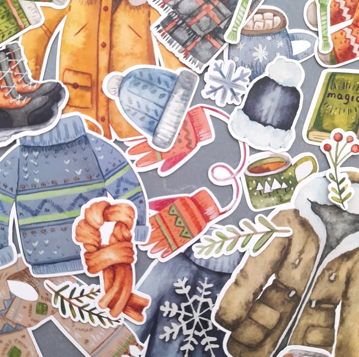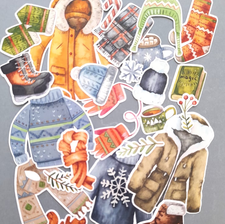 One set of handmade die cuts / ephemera / embellishments with a Christmas winter clothing theme printed onto 250gsm silk card. Perfect for card making, scrap book layouts, memory journaling, etc. There are 25 pieces in each pack. To give an indication of size, the green mug is 2cm and the yellow jacket is 8.5cm.