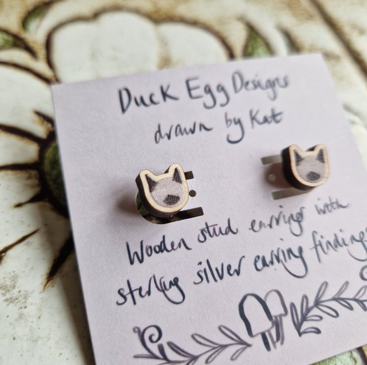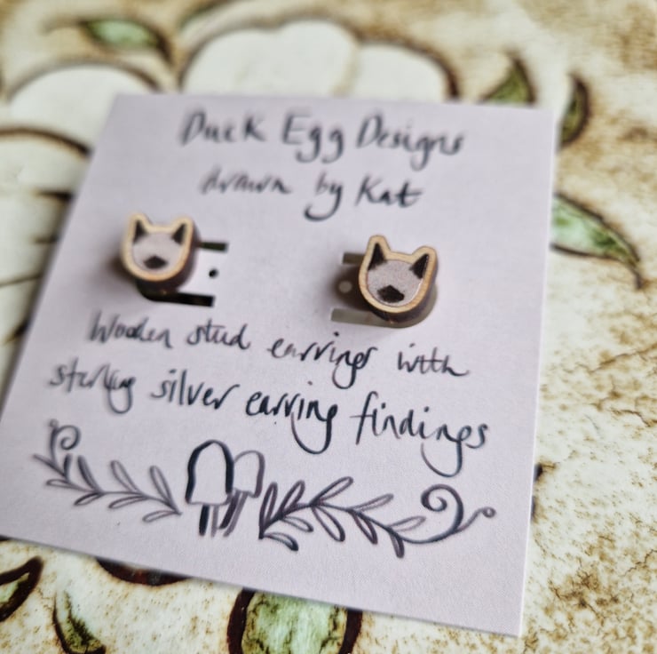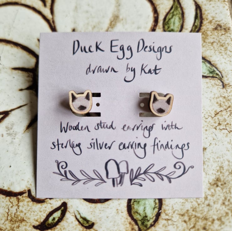 Siamese cat earrings made in my little studio with FSC certified wooden charms featuring my artwork and sterling silver earring findings.
