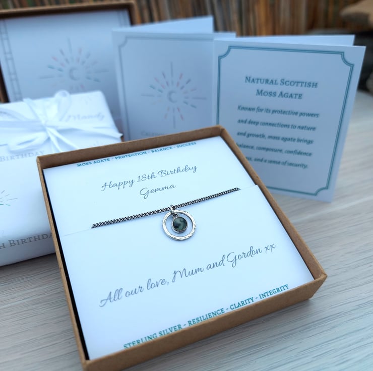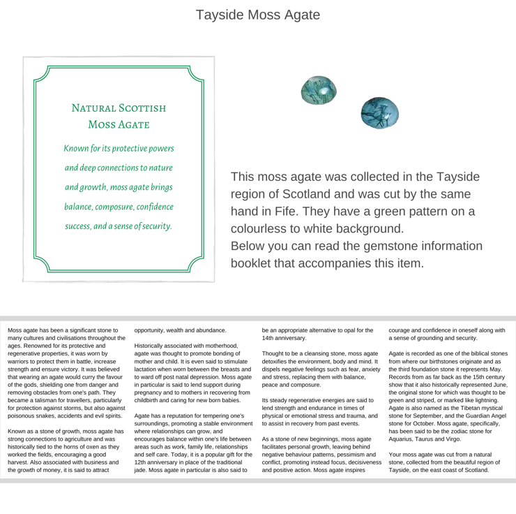 You can read the booklet that comes with my Tayside moss agate designs in the images, or you can find this design with other Scottish stones in the Caledonian Keepsakes shop.