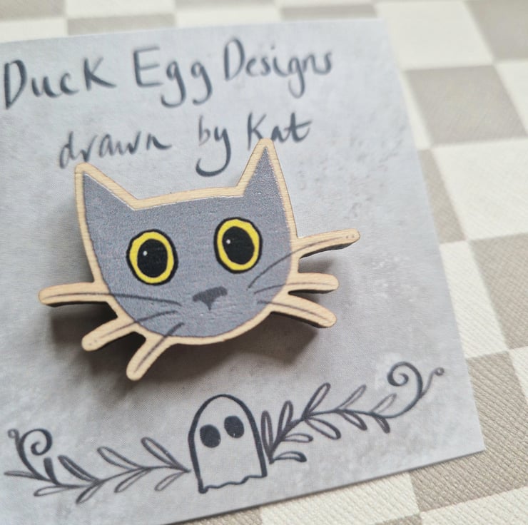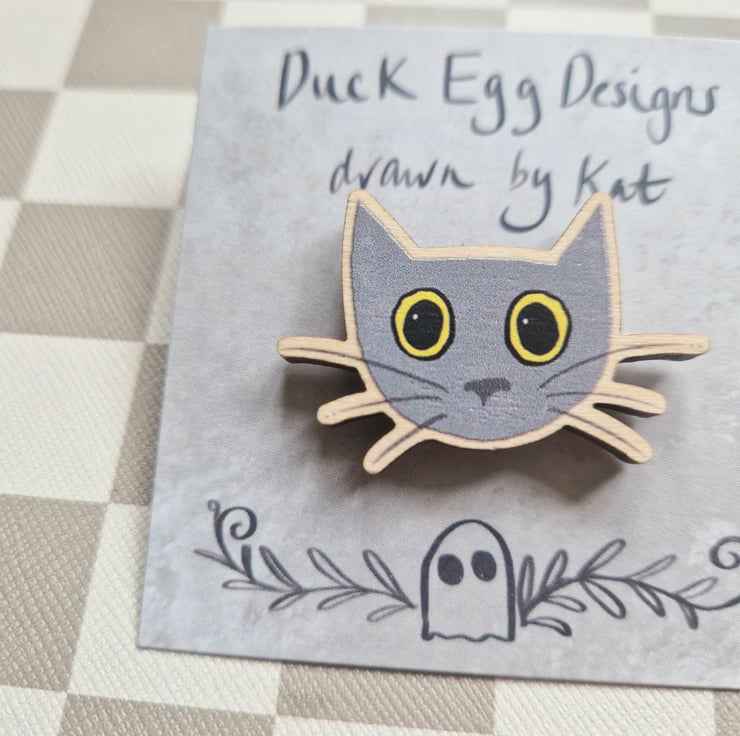Grey cat pin badge illustrated by me and made in the UK using FSC certified wood.