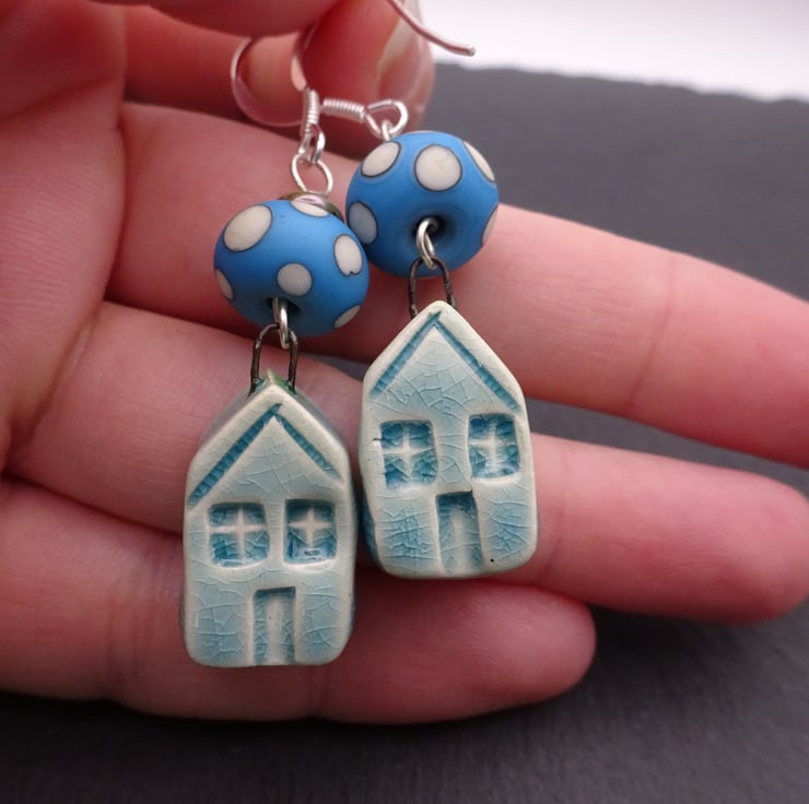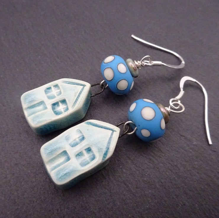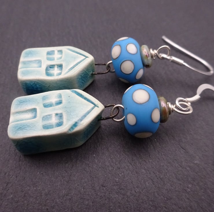 A pair of earrings made with sterling silver ear wires, my handmade lampwork glass beads which are turquoise blue with ivory spots and handmade ceramic house charms.