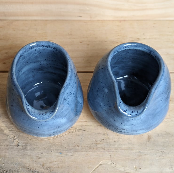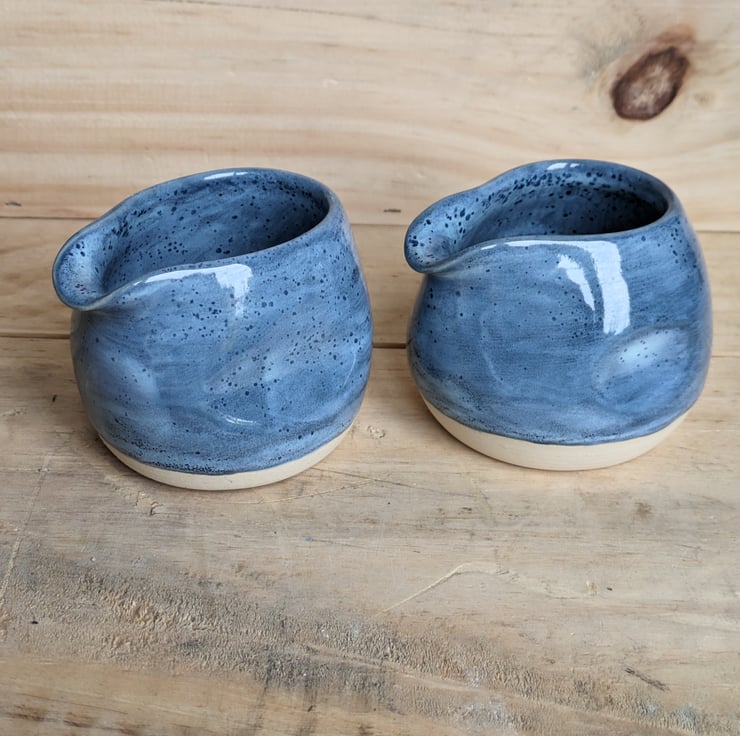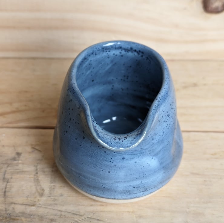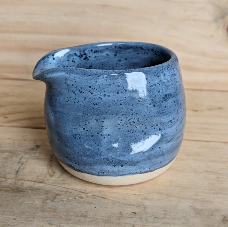 Great wee speckled blue glaze milk/cream squat jug in white clay with a broader finger/thumb indentation in the sides & slightly elongated top. Tricky to show in a photo!