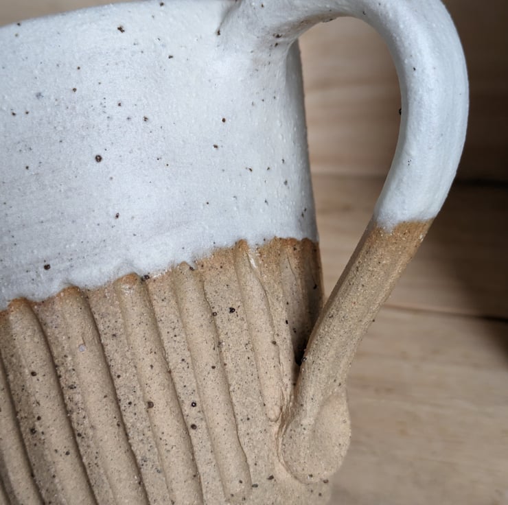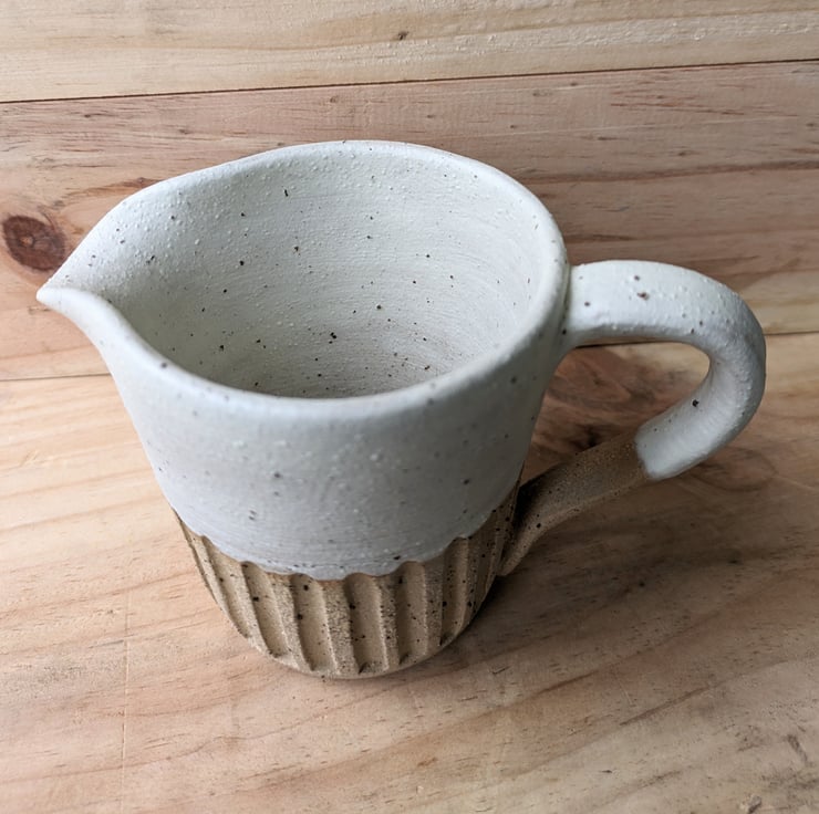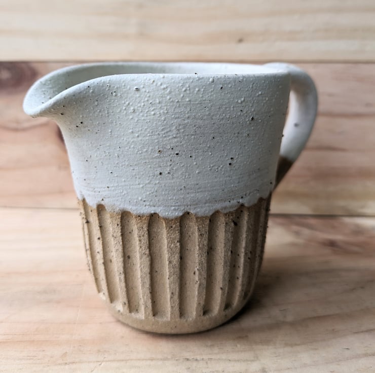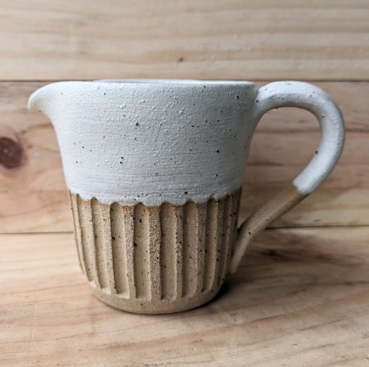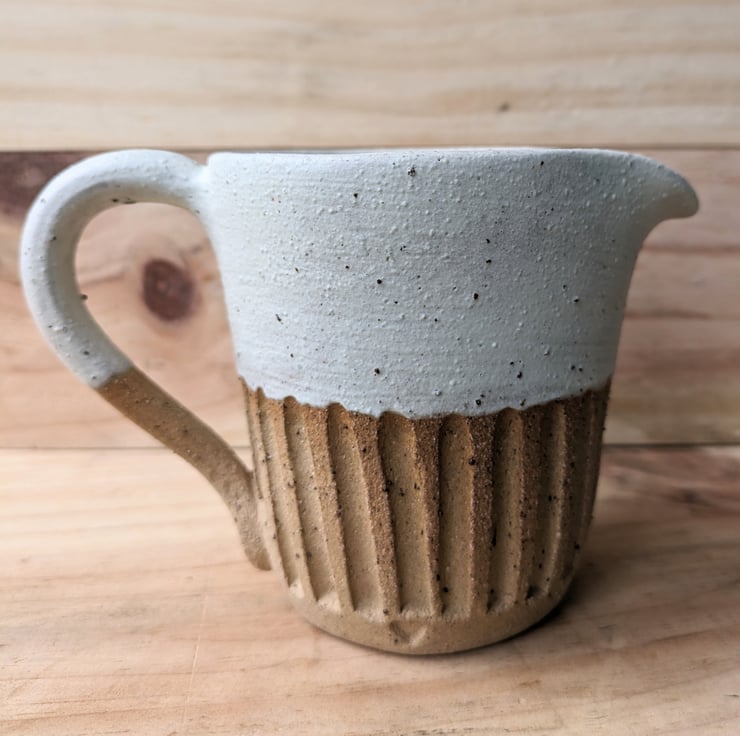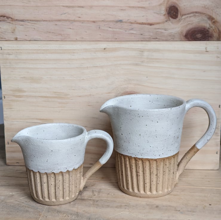 I've used a speckled clay for these jugs which shows through the matte cream glaze when fired, giving a lovely texture. Have left the bottom carved section unglazed. This is the perfect size for milk, cream or even custard or gravy. As you can see from the photos, there's also a larger version of this available and a fully glazed version of both sizes. Fired to c1200 degrees (stoneware temperature) and this makes the jugs more durable.