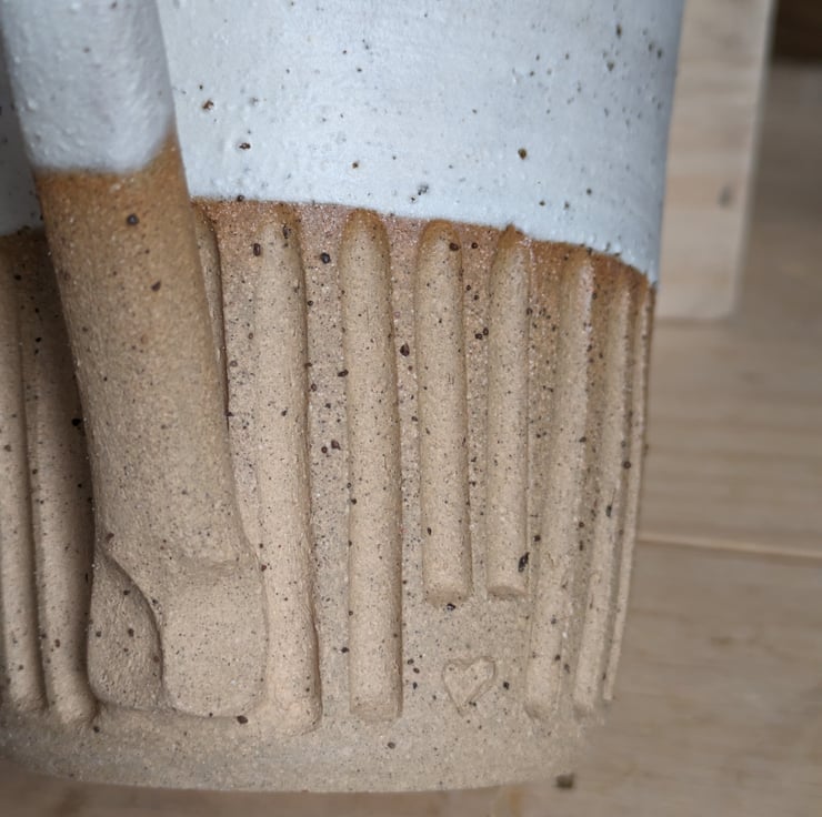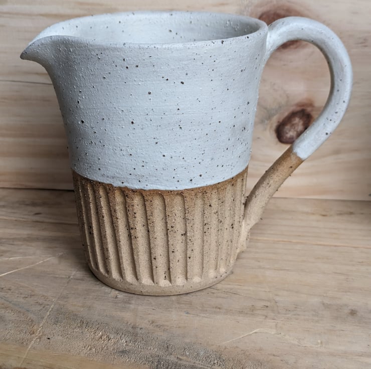 I've used a speckled clay for these jugs which shows through the matte cream glaze when fired, giving a lovely texture. Have left the bottom carved section unglazed. This is the perfect size for milk, custard or gravy when there are several of you eating! As you can see from the photos, there's also a smaller version of this available and a fully glazed version of both sizes. Fired to c1200 degrees (stoneware temperature) and this makes the jugs more durable.