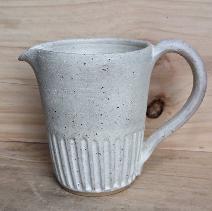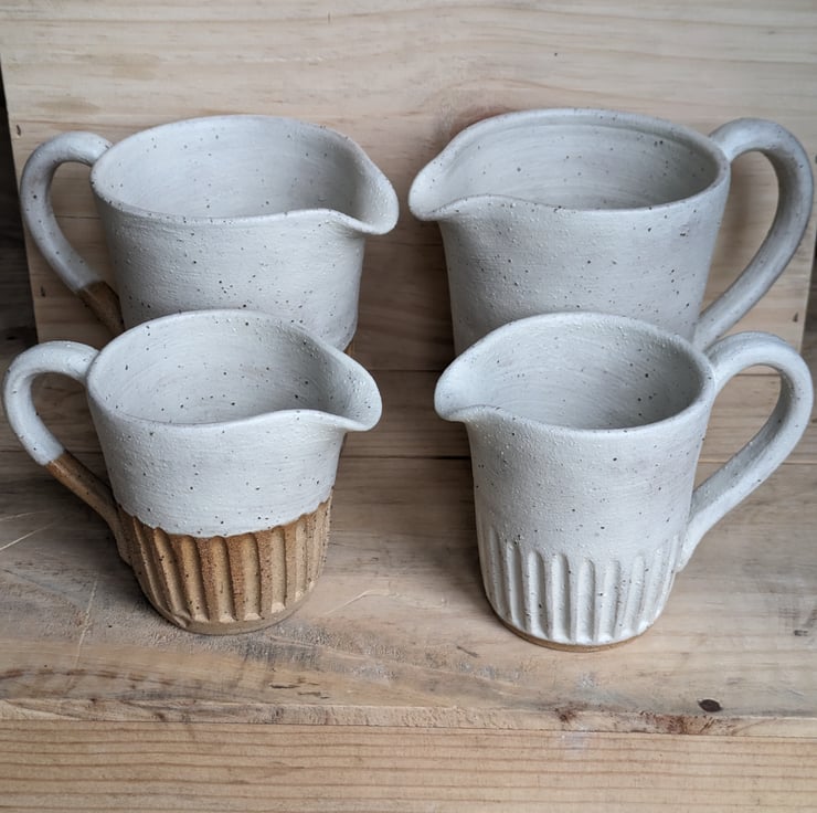 I've used a speckled clay for these jugs which shows through the matte cream glaze when fired, giving a lovely texture. This is a great size for milk, custard or gravy when there are several of you eating! As you can see from the photos, there's also a smaller version of this available and a part-glazed version of both sizes. Fired to c1200 degrees (stoneware temperature) and this makes the jugs more durable.