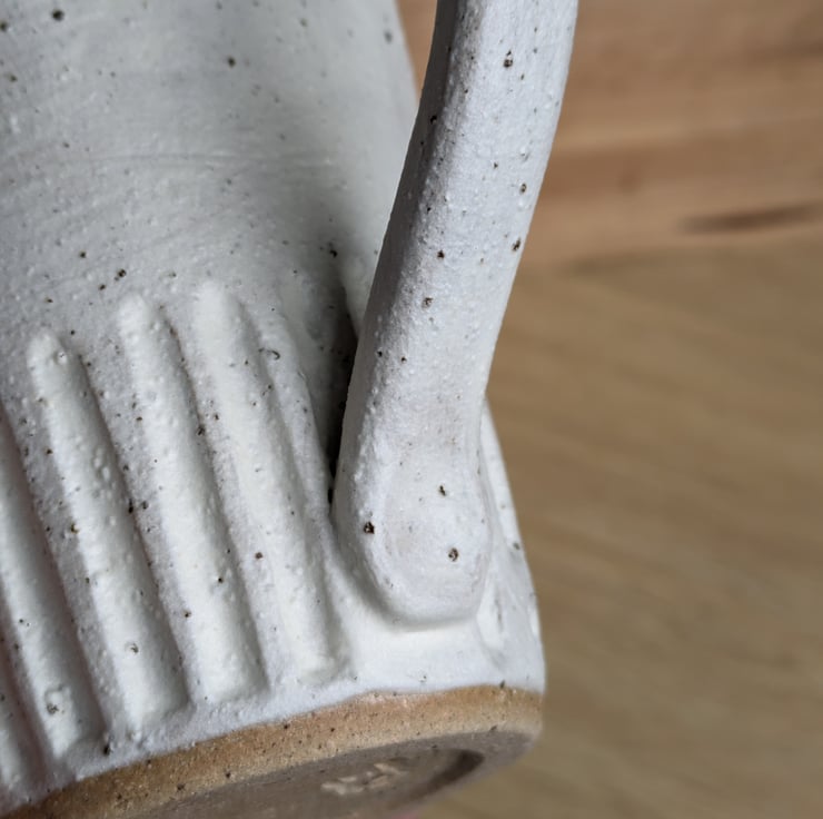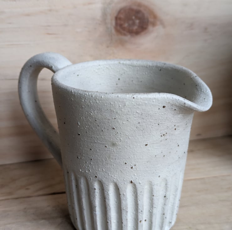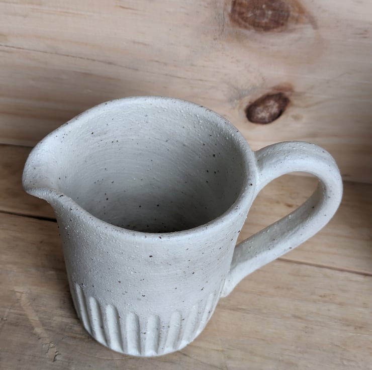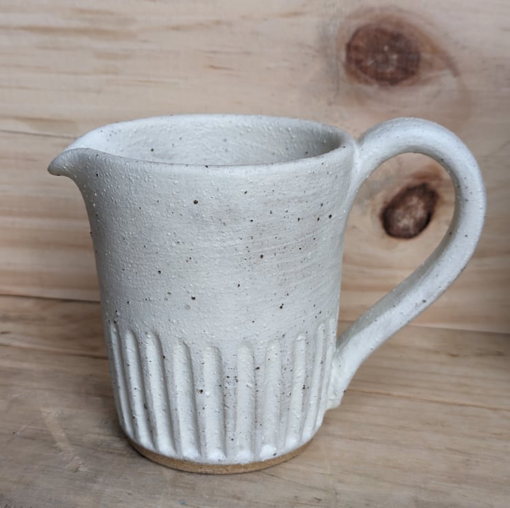 I've used a speckled clay for these jugs which shows through the matte cream glaze when fired, giving a lovely texture. This is a great size for milk, cream, custard or gravy! As you can see from the photos, there's also a larger version of this available and a part-glazed version of both sizes. Fired to c1200 degrees (stoneware temperature) and this makes the jugs more durable.