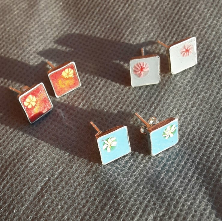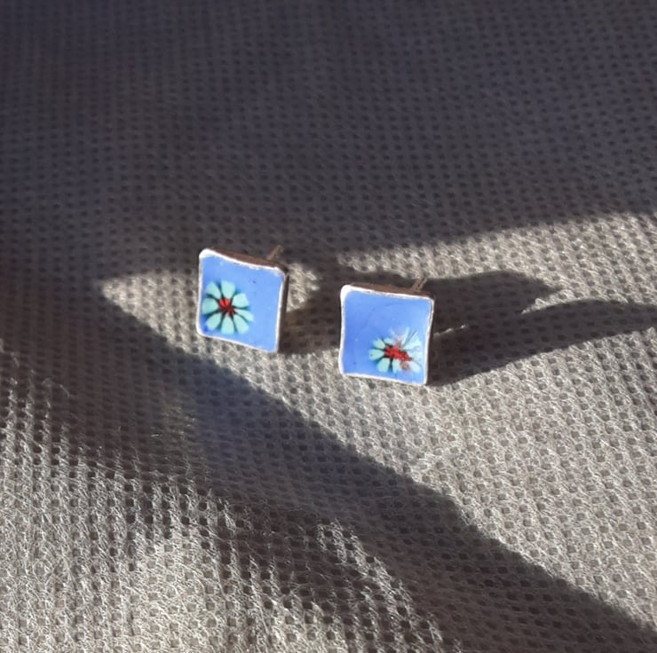 Made from sterling silver, these exquisite little stud earrings have been filled with wet enamel, then fired to 830 degrees C. I have added a small enamelled flower into each bezel and re-fired in the kiln. The posts and butterfly backs are also in sterling silver. They arrive boxed and make a wonderful gift.