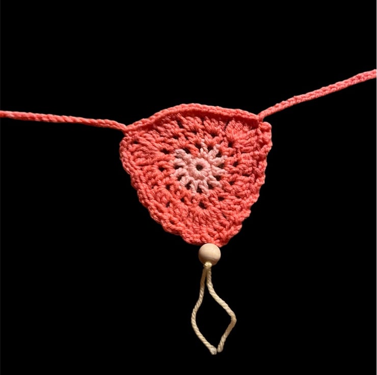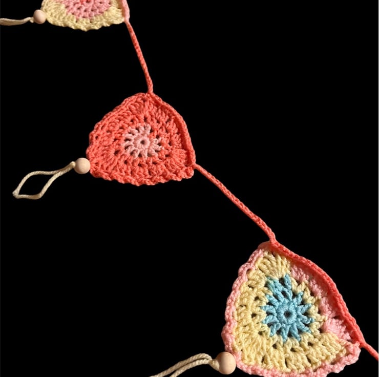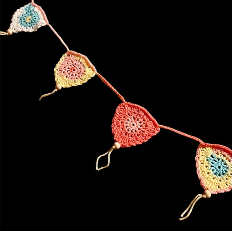 This beautiful Boho bunting is crocheted from pastel multi-coloured acrylic yarn and embellished with natural wooden beads.
