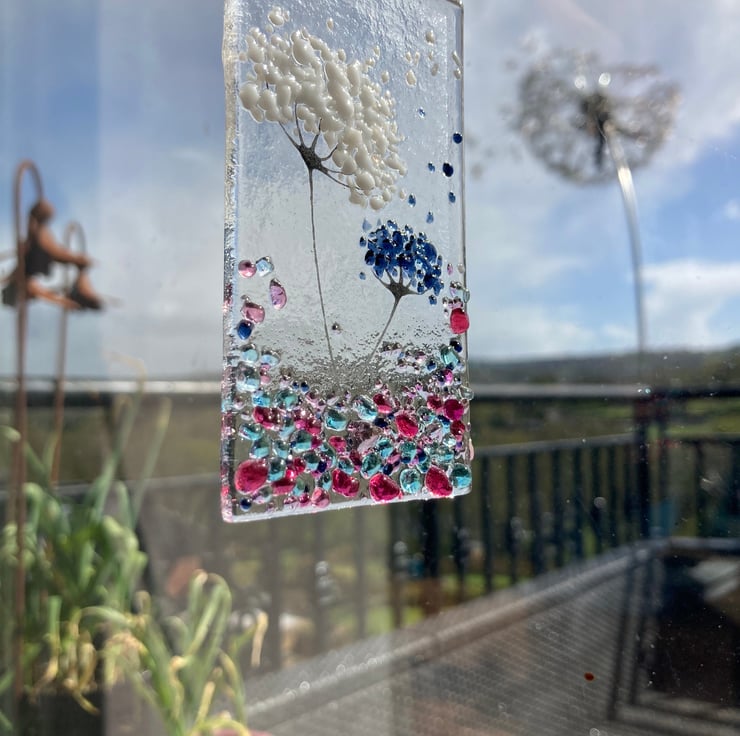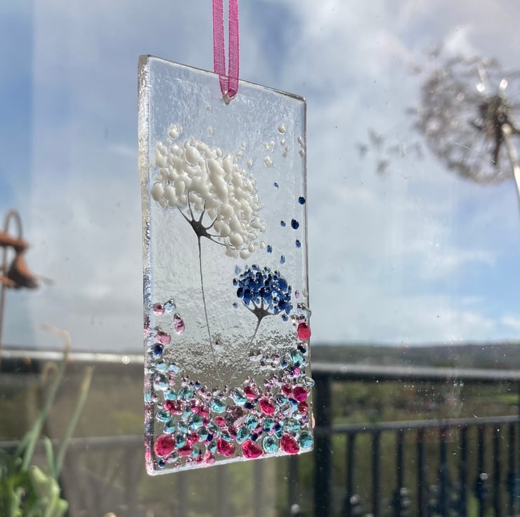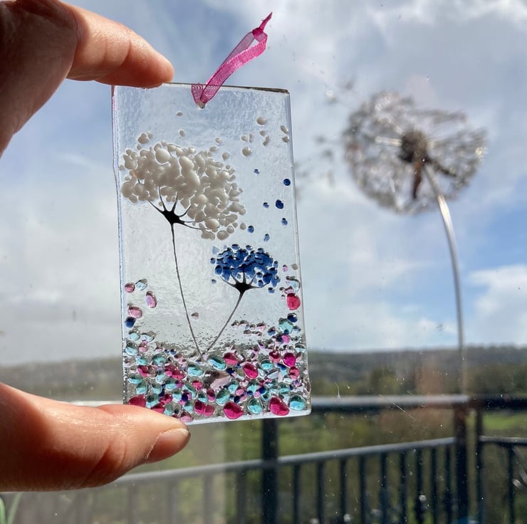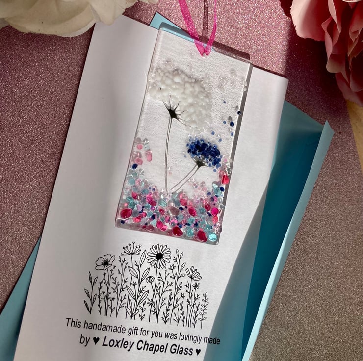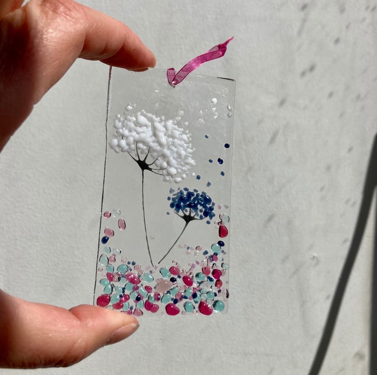 Little whimsical 3 Fused glass white & midnight blue Jewels Flowers Sun catcher