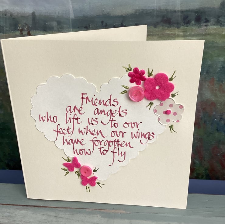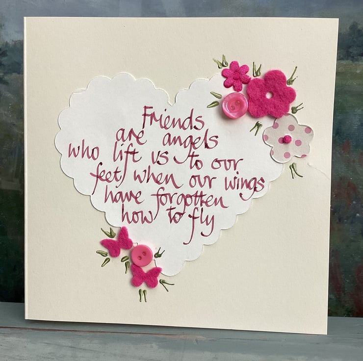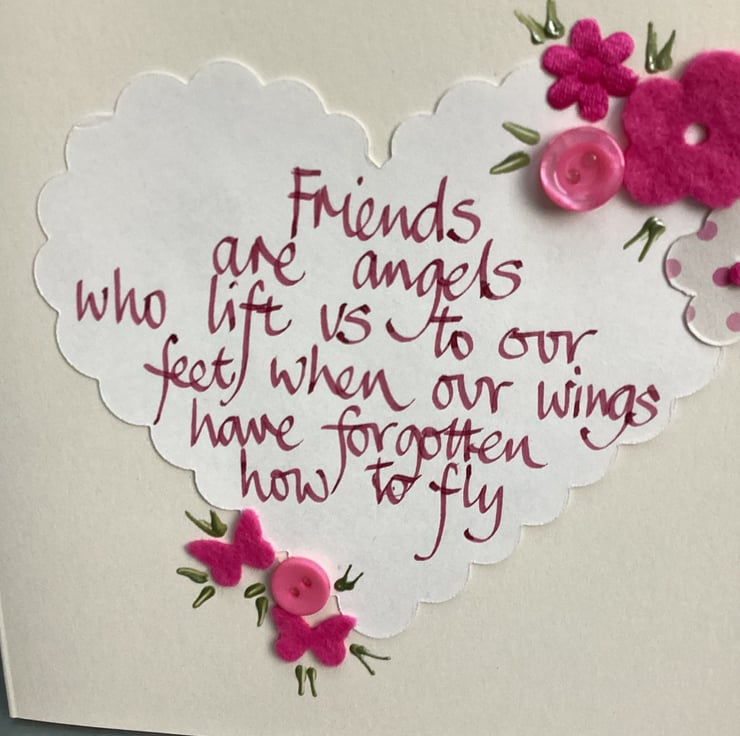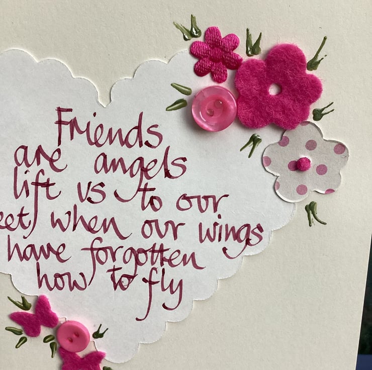 Friends are angels who lift us to our feet when our wings have forgotten how to fly. Handwritten words onto a heart which is embellished with felt, paper ,buttons.