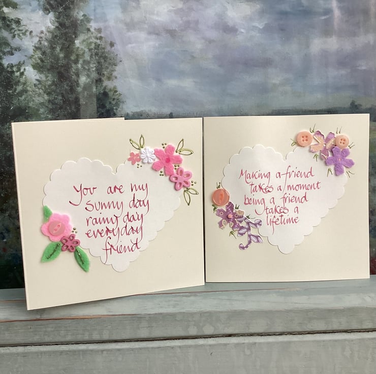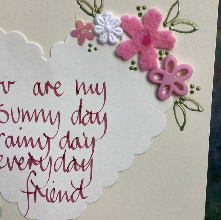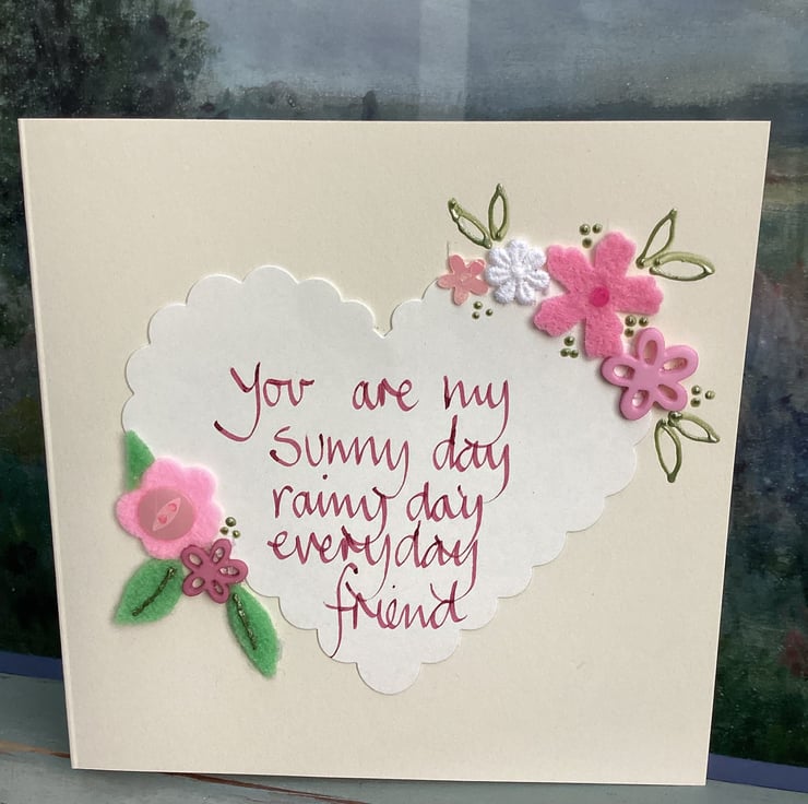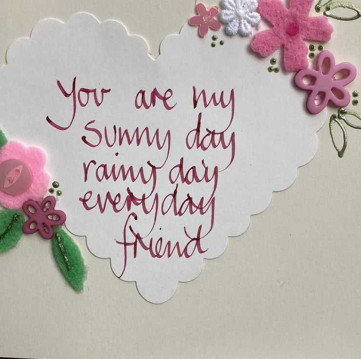 You are my sunny day,rainy day,everyday friend. Handwritten words onto a heart which is embellished with felt,paper,buttons.