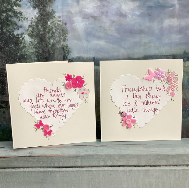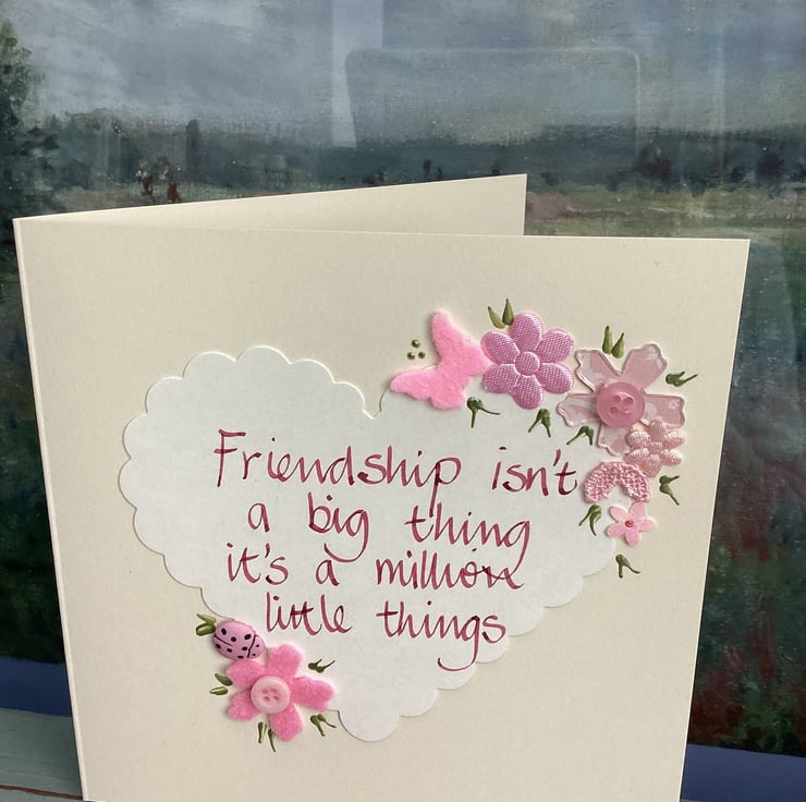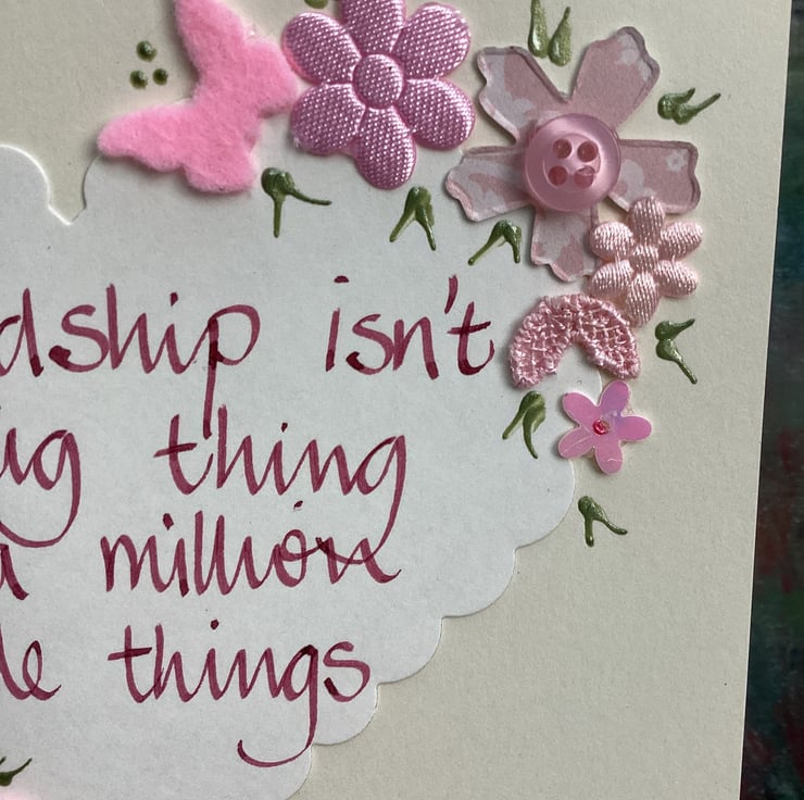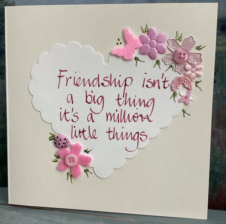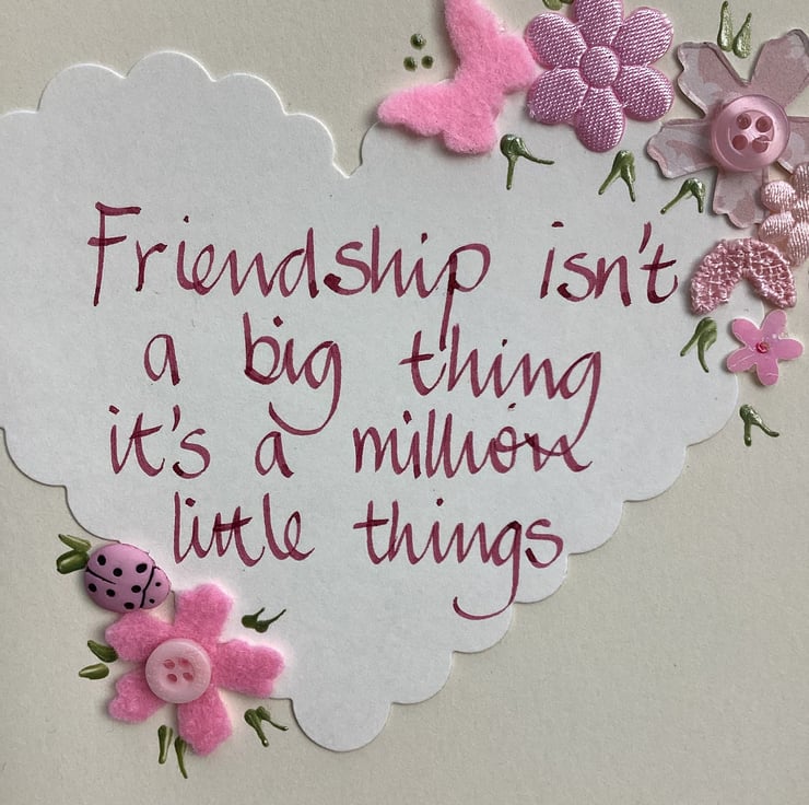 Friendship isn't a big thing it's a million little things. Handwritten words onto a heart which is embellished with felt,paper,buttons.