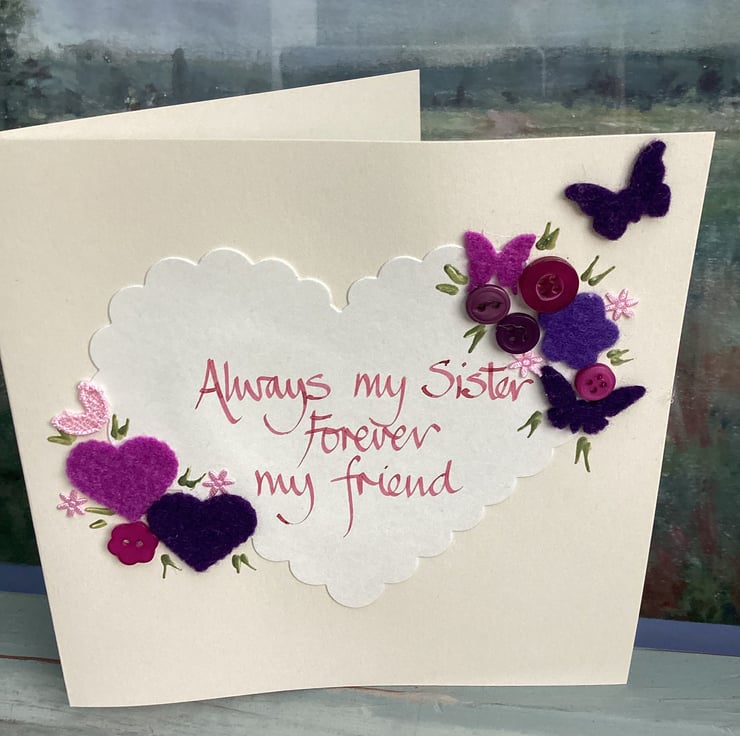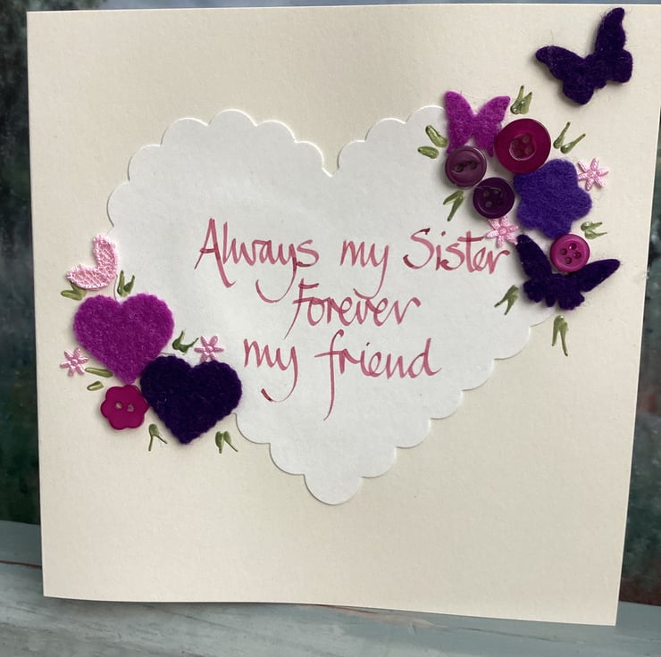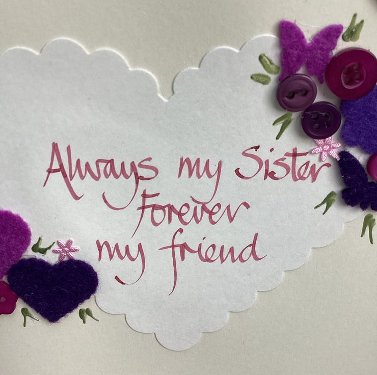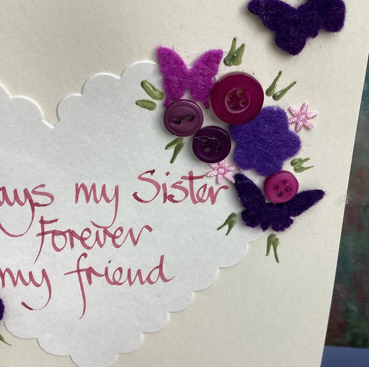 Always my sister forever my friend.Handwritten words onto a heart which is embellished with felt,paper,buttons.